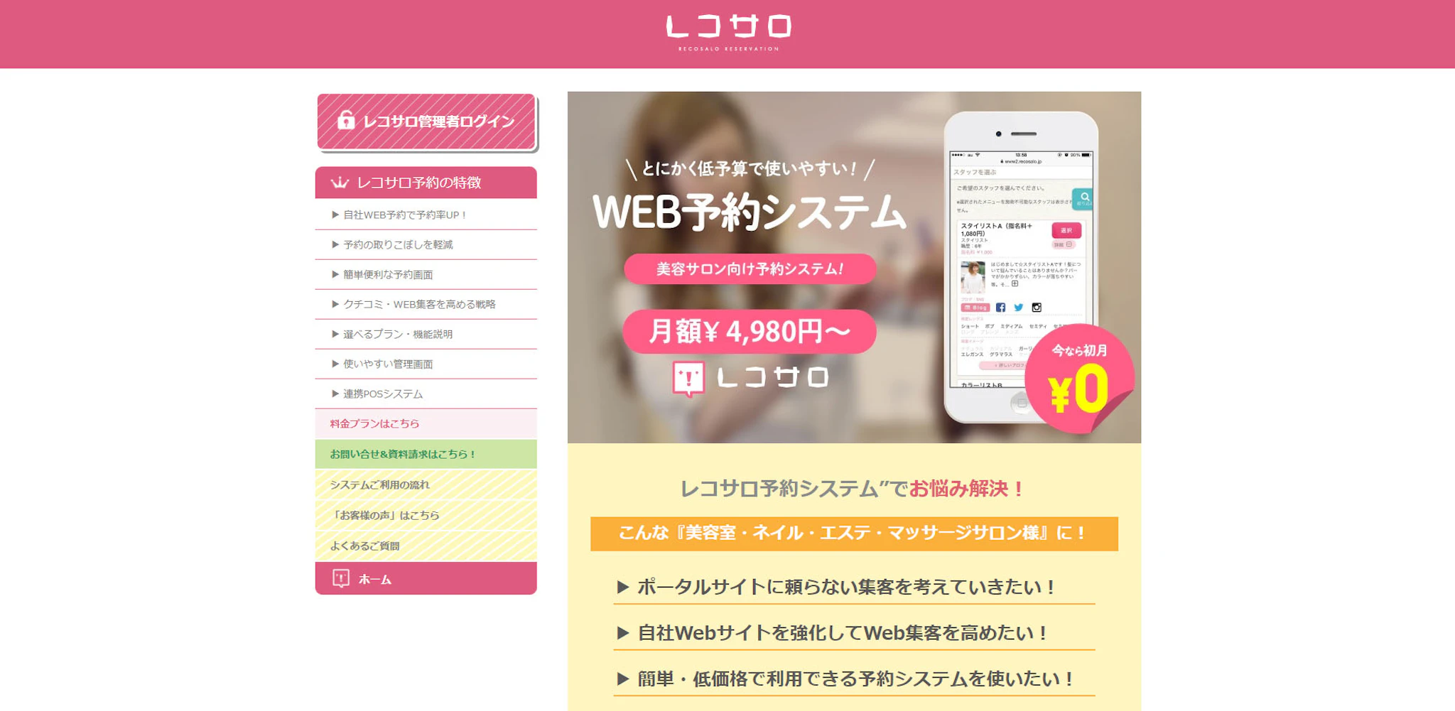 低予算でも美容室などに特化した機能が利用できるので、コストパフォーマンスの高いシステムといえます。初月は利用料金が無料なのも魅力です。