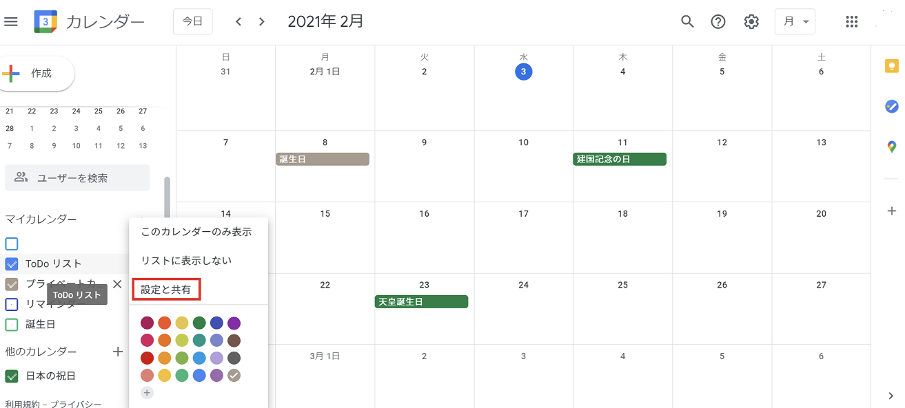 やり方は画面左側のそれぞれのカレンダー名の後ろにある縦の…をクリックすると小さなウインドウが開き、そこに設定と共有というメニューが表示されます。