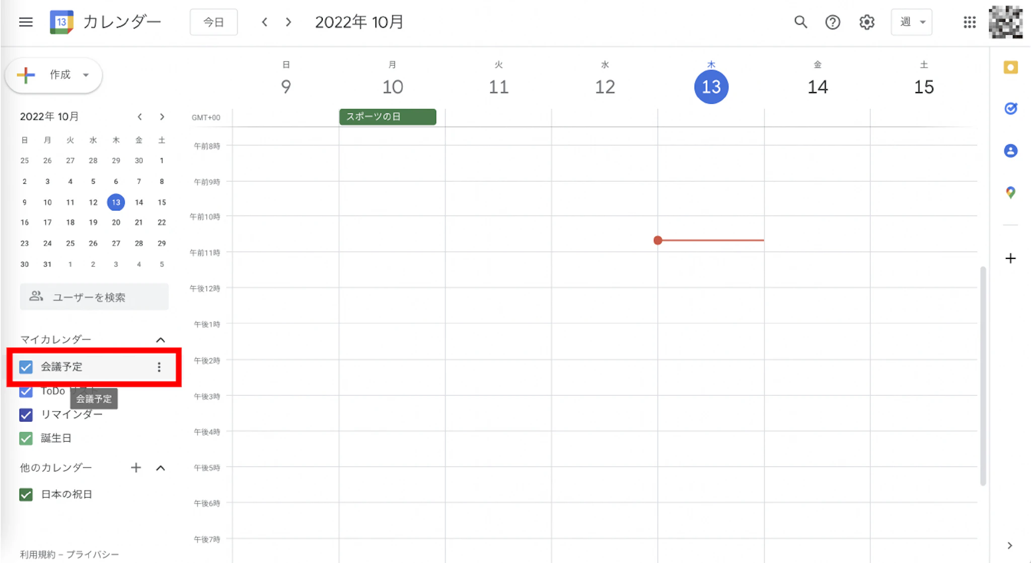 次に他のユーザーと共有したい予定にマウスカーソルを合わせます。ここでは「会議予定」という予定を他のユーザーに共有するとします。