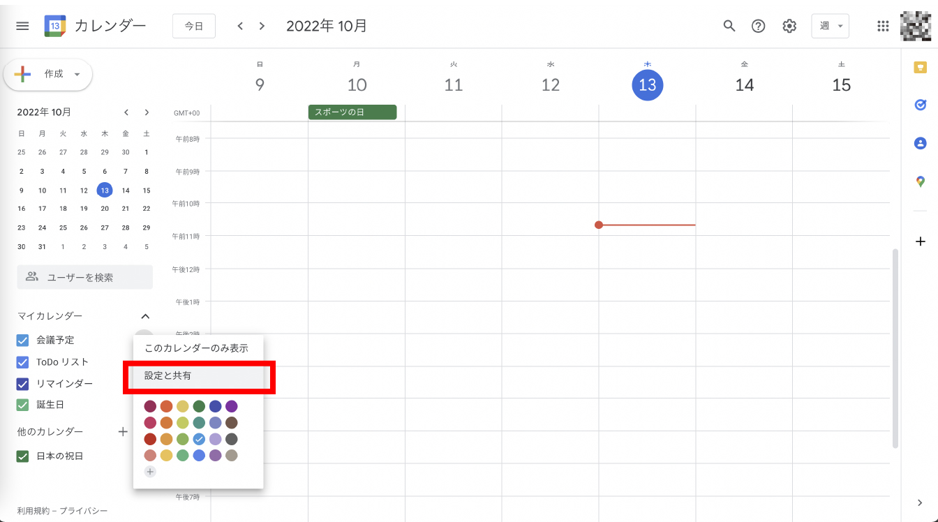 設定と共有」をクリックすると、Googleカレンダーに登録されている各予定の設定ページに遷移します。