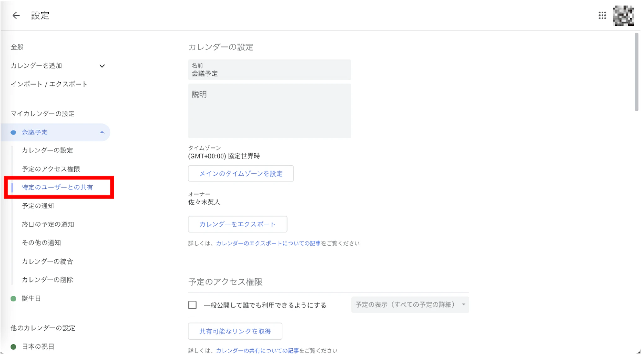 ページの左側にある「特定のユーザーとの共有」を選択しましょう。