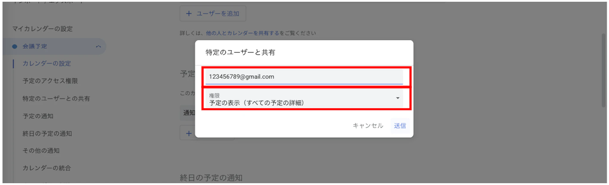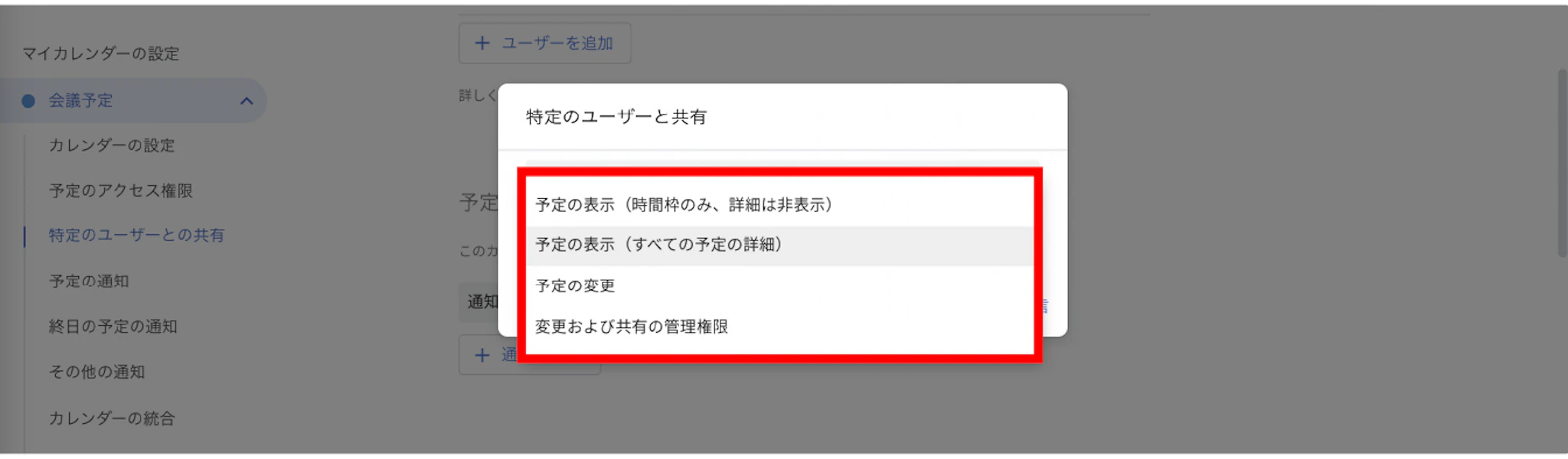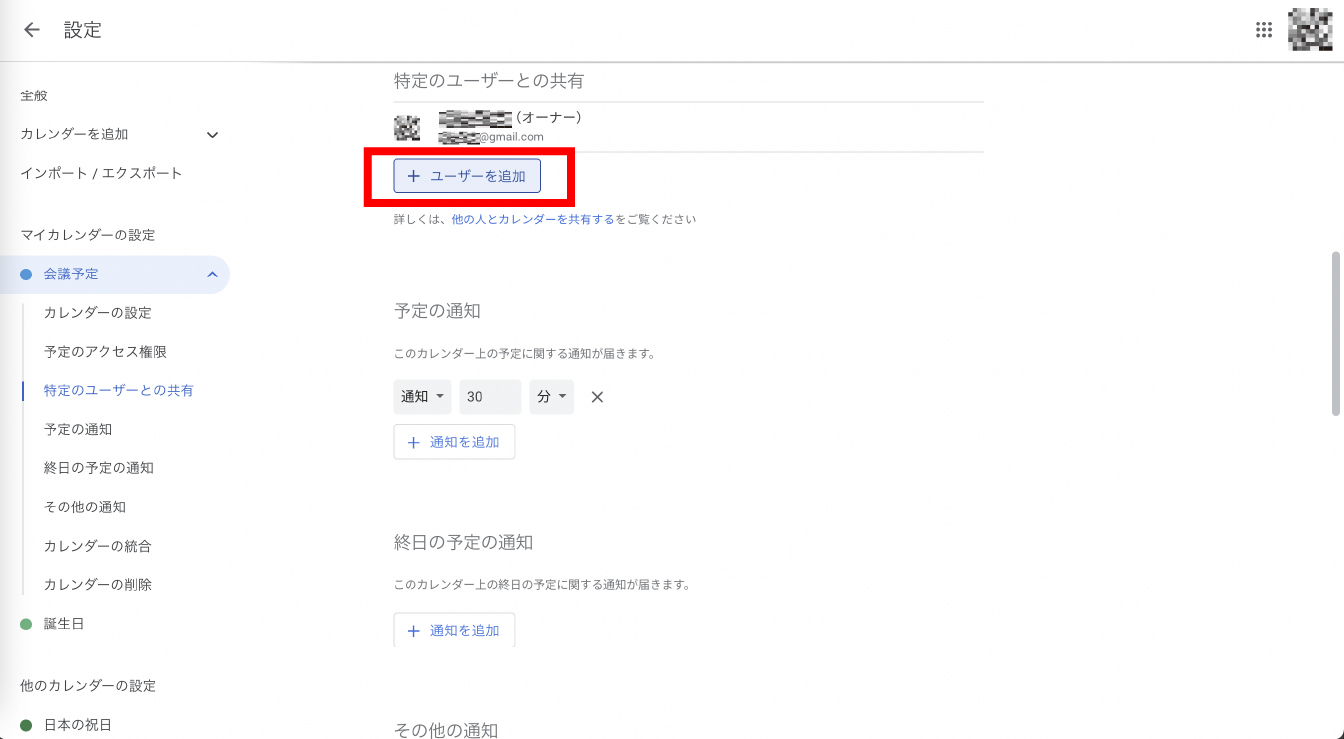 すると、特定のユーザーを追加する項目が表示されます。ここにある「+ユーザーを追加」で予定を共有したい社内メンバーや友人の情報を追加します。