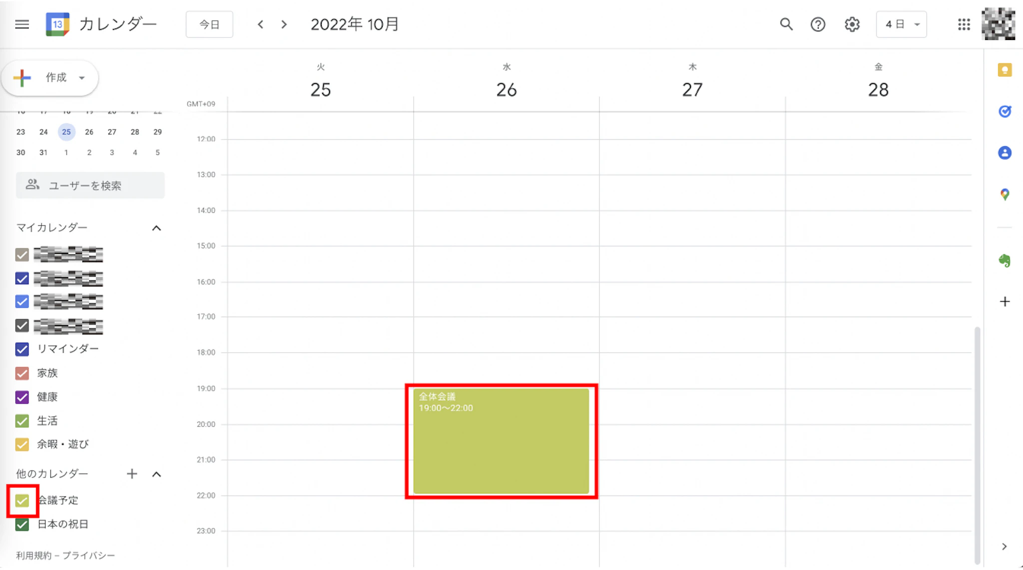 共有された予定の左横にあるチェックマークをつけたり、外したりすることで予定の表示/非表示の変更ができます。