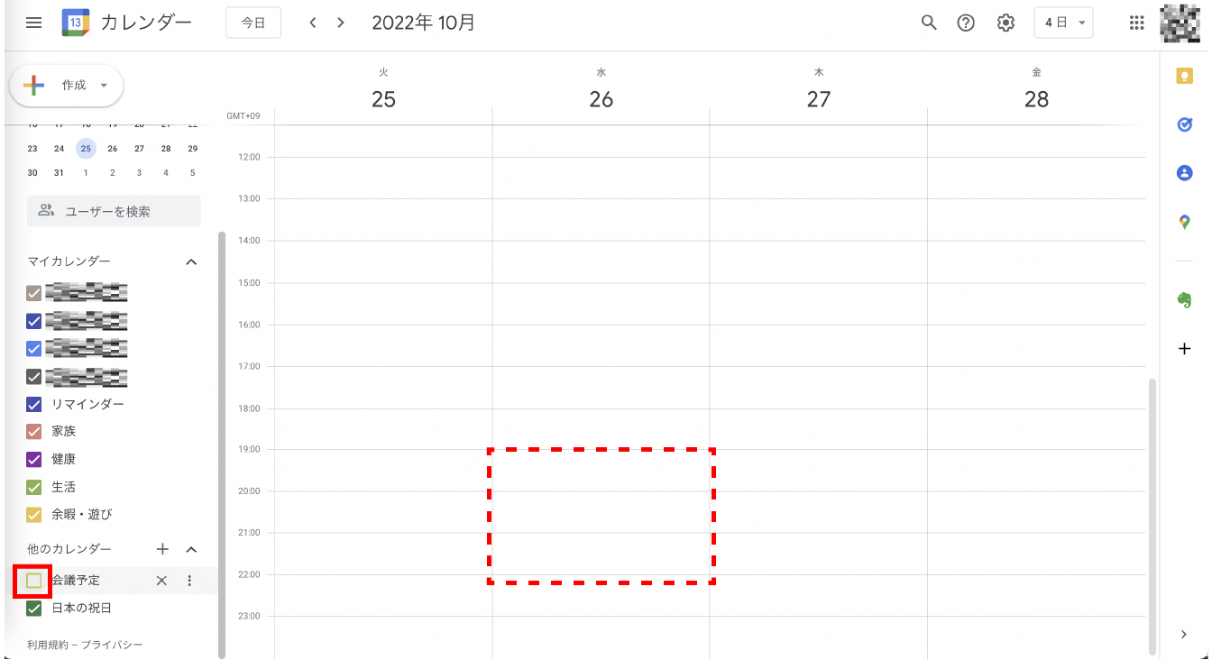 上の図のようにチェックを外すと表示されていた日時から予定が消えます。
