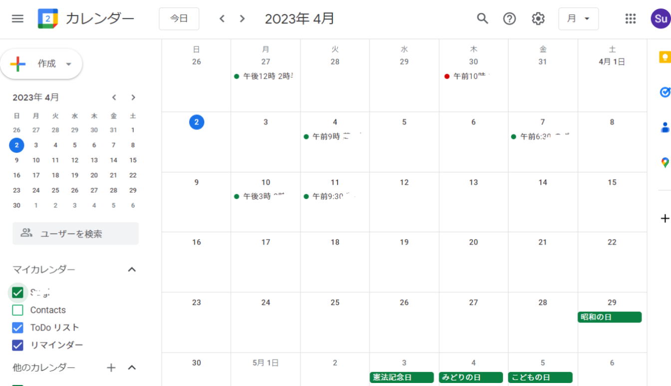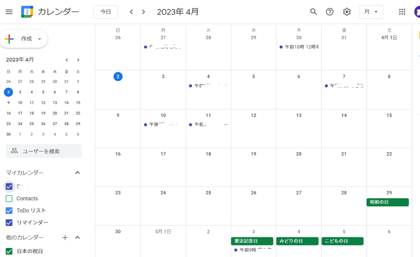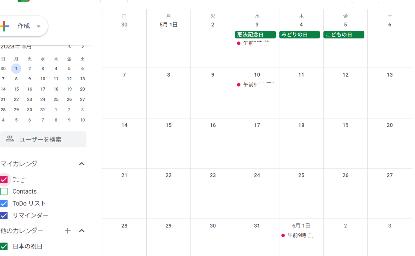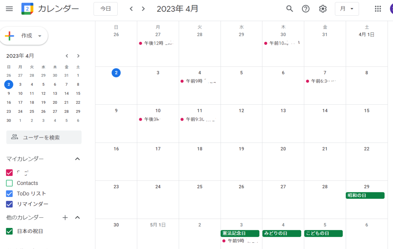 Googleカレンダーにログインすると、上記のようにあなたが設定しているカレンダーが表示されます。