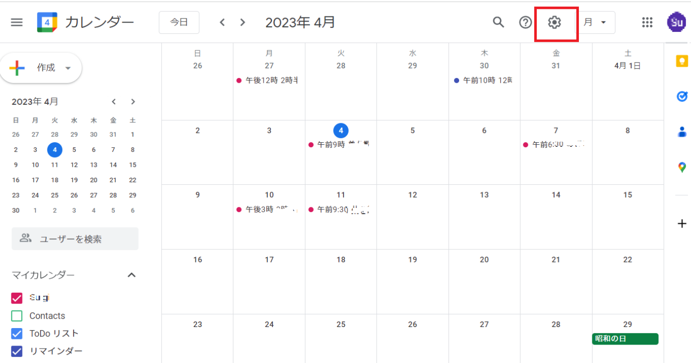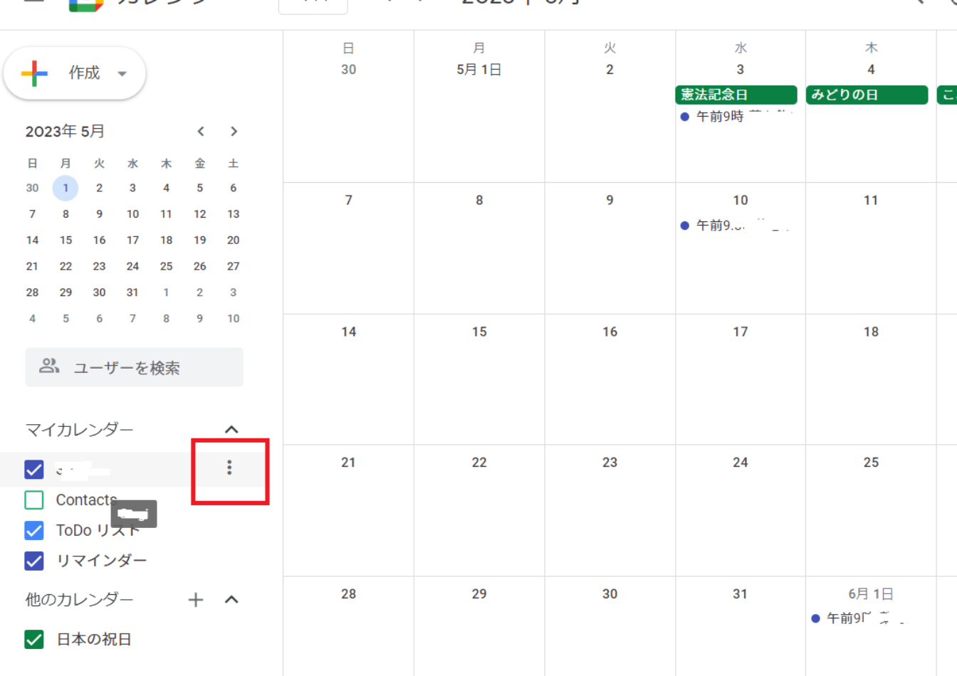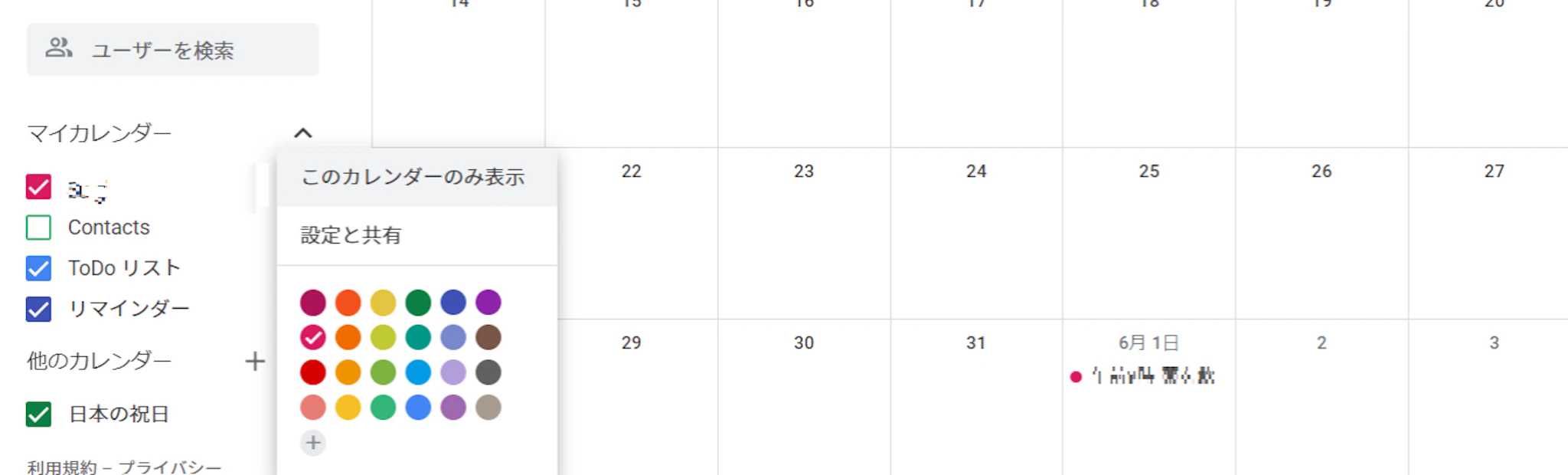 Googleカレンダーにアクセスしたら、個別で色分け設定をしたいマイカレンダーを開いてください。