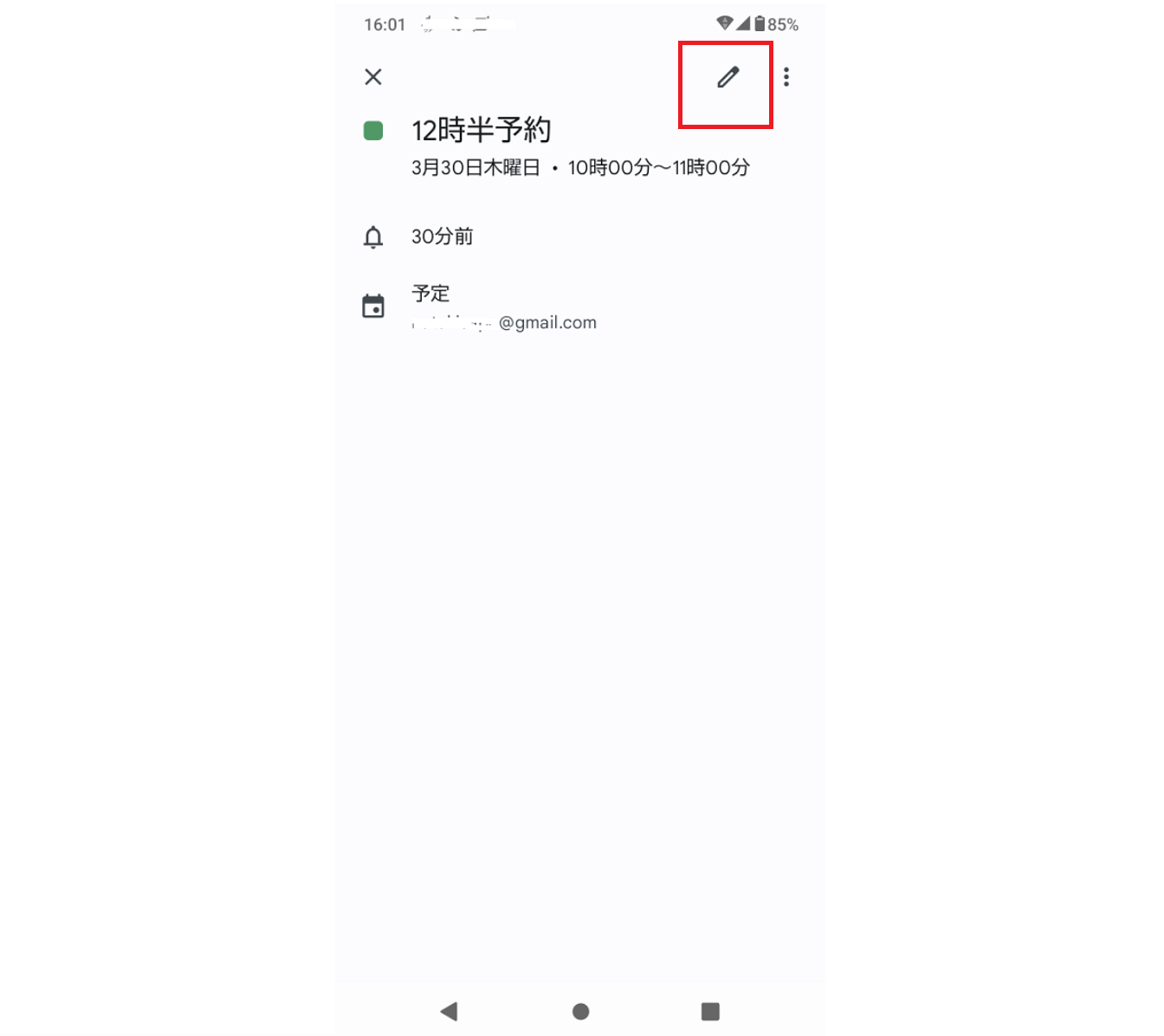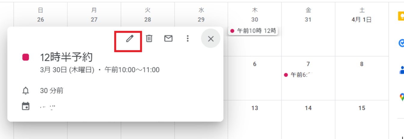 3月30日の予定をクリックすると、上記のようにポップアップが表示されるので、鉛筆マークの「編集」を選択してください。