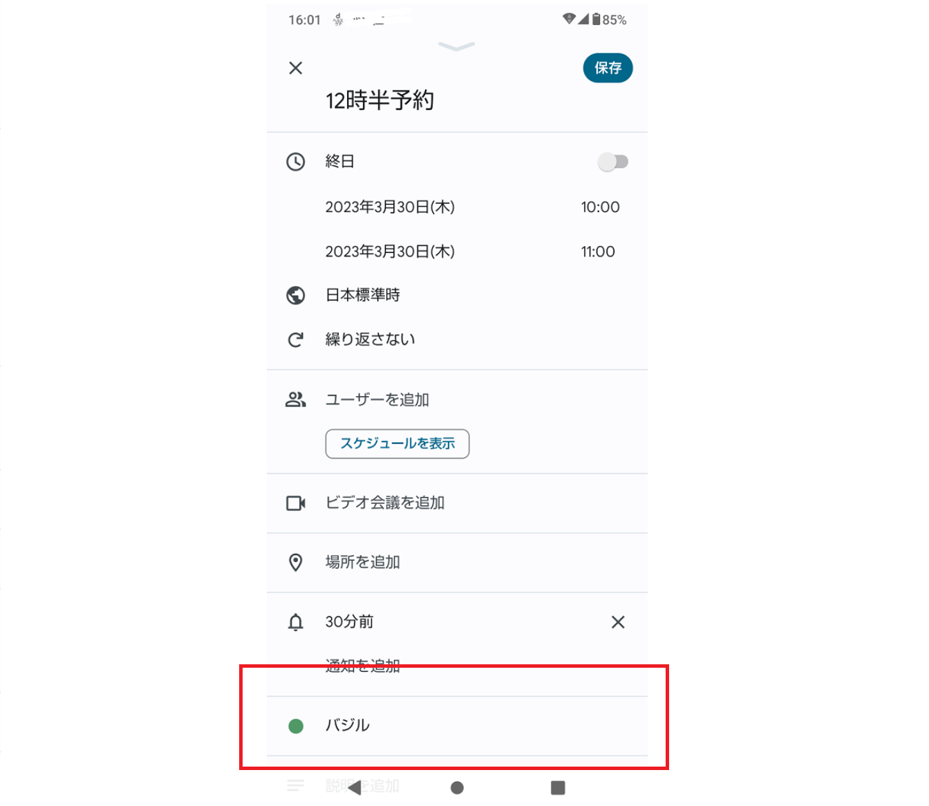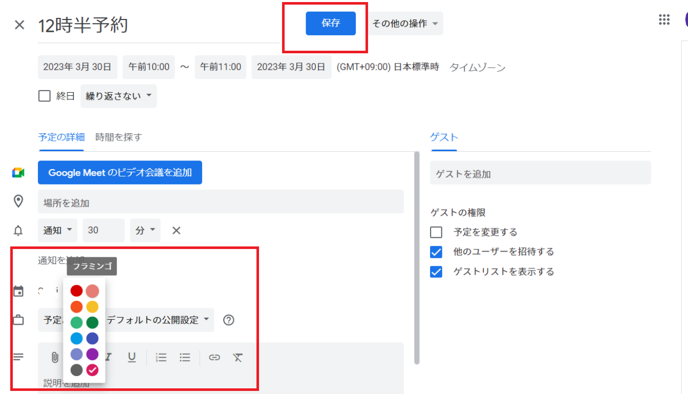 以下の画像にて、現在バジルの色に設定している2023年3月30日の予定だけ、ほかの色に変更していきましょう。