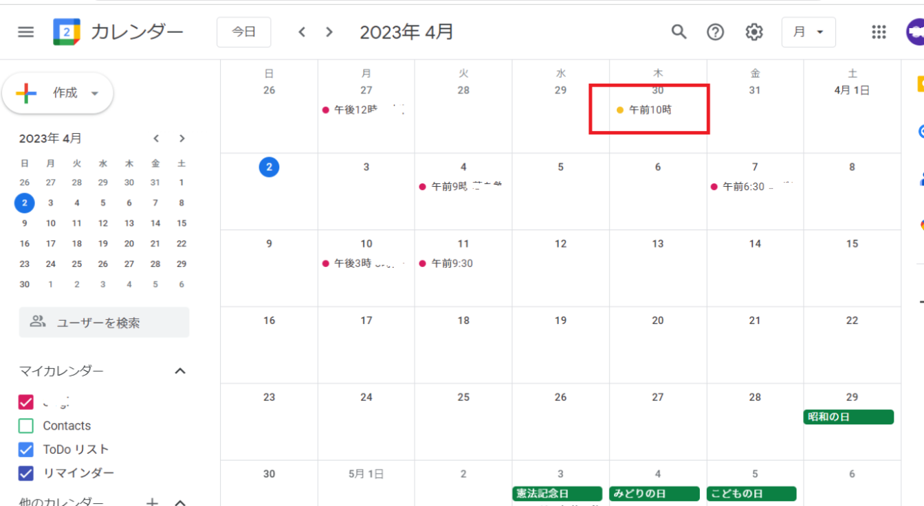 今回は、2023年3月30日の予定を色分けするので、3月30日に書いてある文字をクリックします。