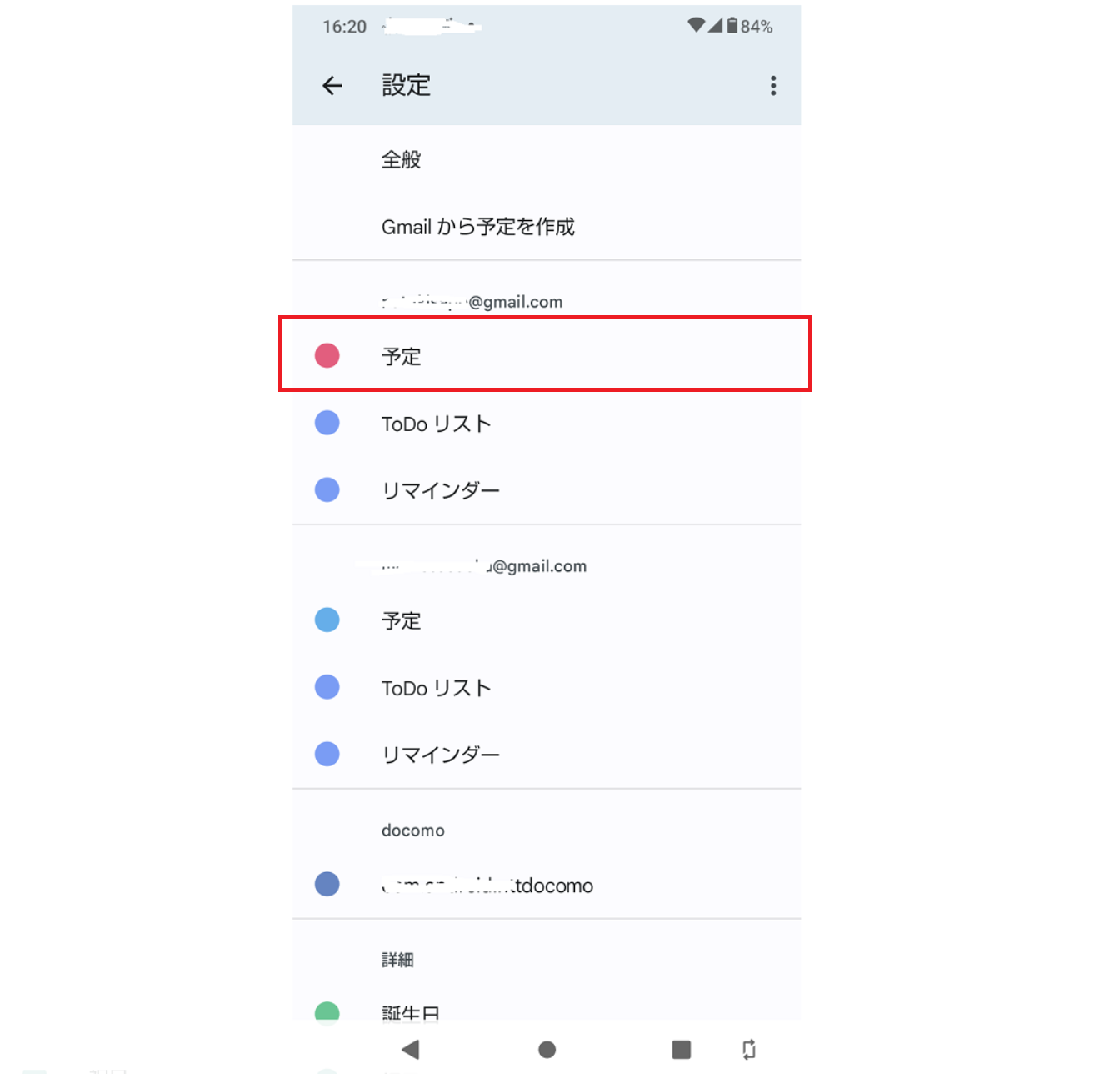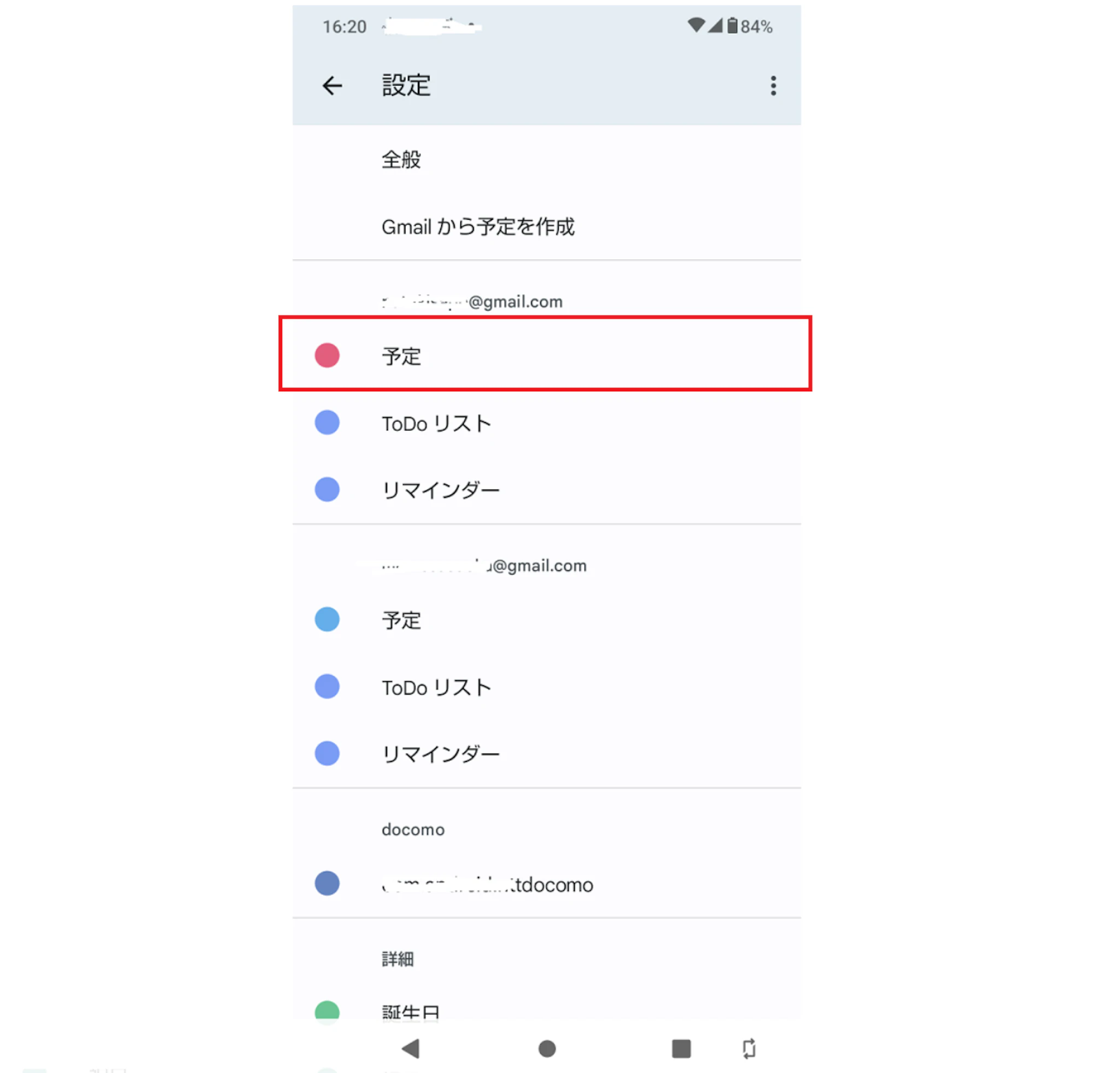 上記の画面から、色分けしたいアカウントの下部にある「予定」をタップしてください。