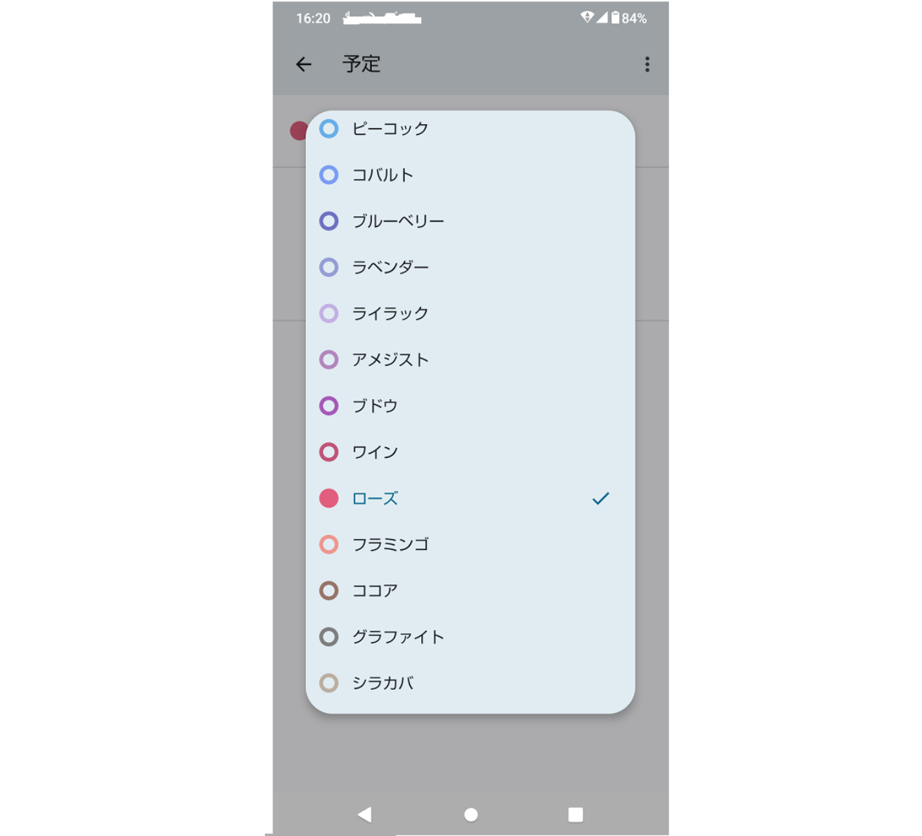 ローズを選択すると、「ブルーベリー」で表示されていた予定が一括で「ローズ」に変わりました。