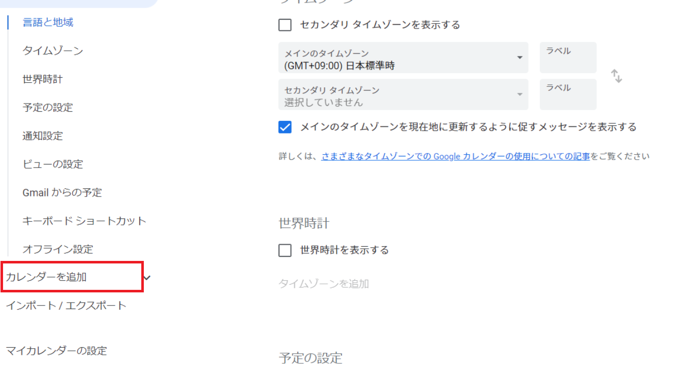左の下部に表示されるメニューから「カレンダーを追加」をクリックしましょう。