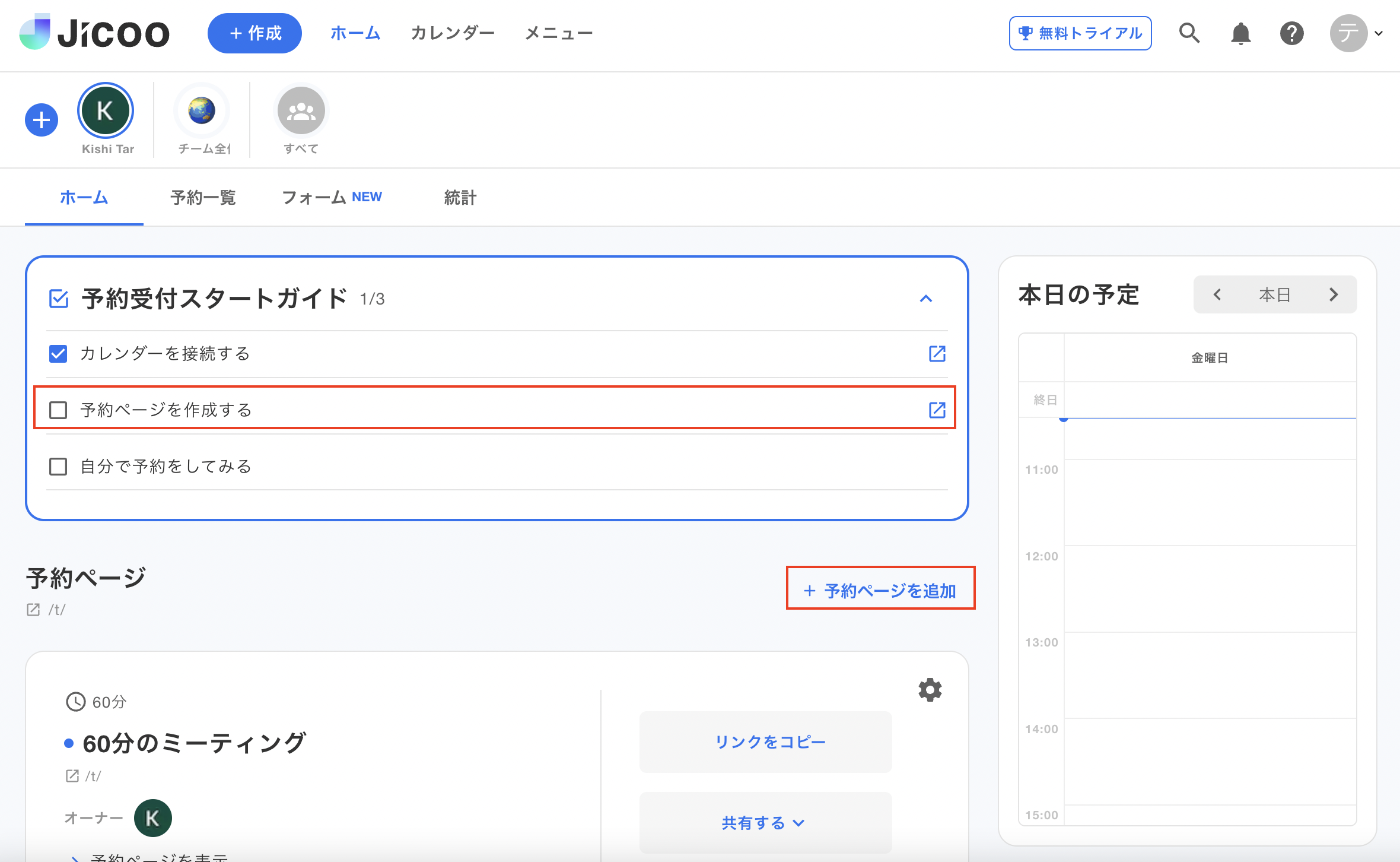 アカウント登録時点からサンプルの予約ページが用意されていますので、それを編集して利用することも可能です。