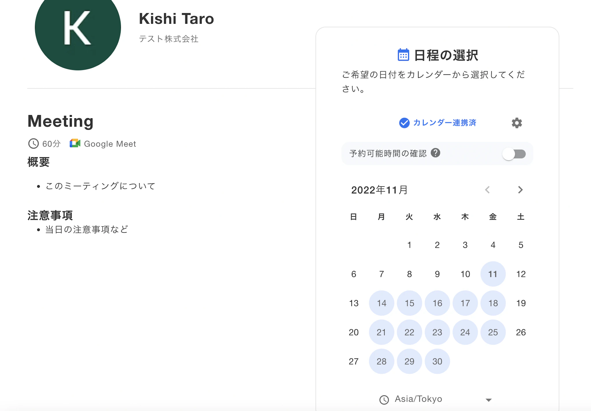 候補日が表示されているのが確認できます。またカレンダー連携している場合には、予定がある日時はブロックした状態となります。