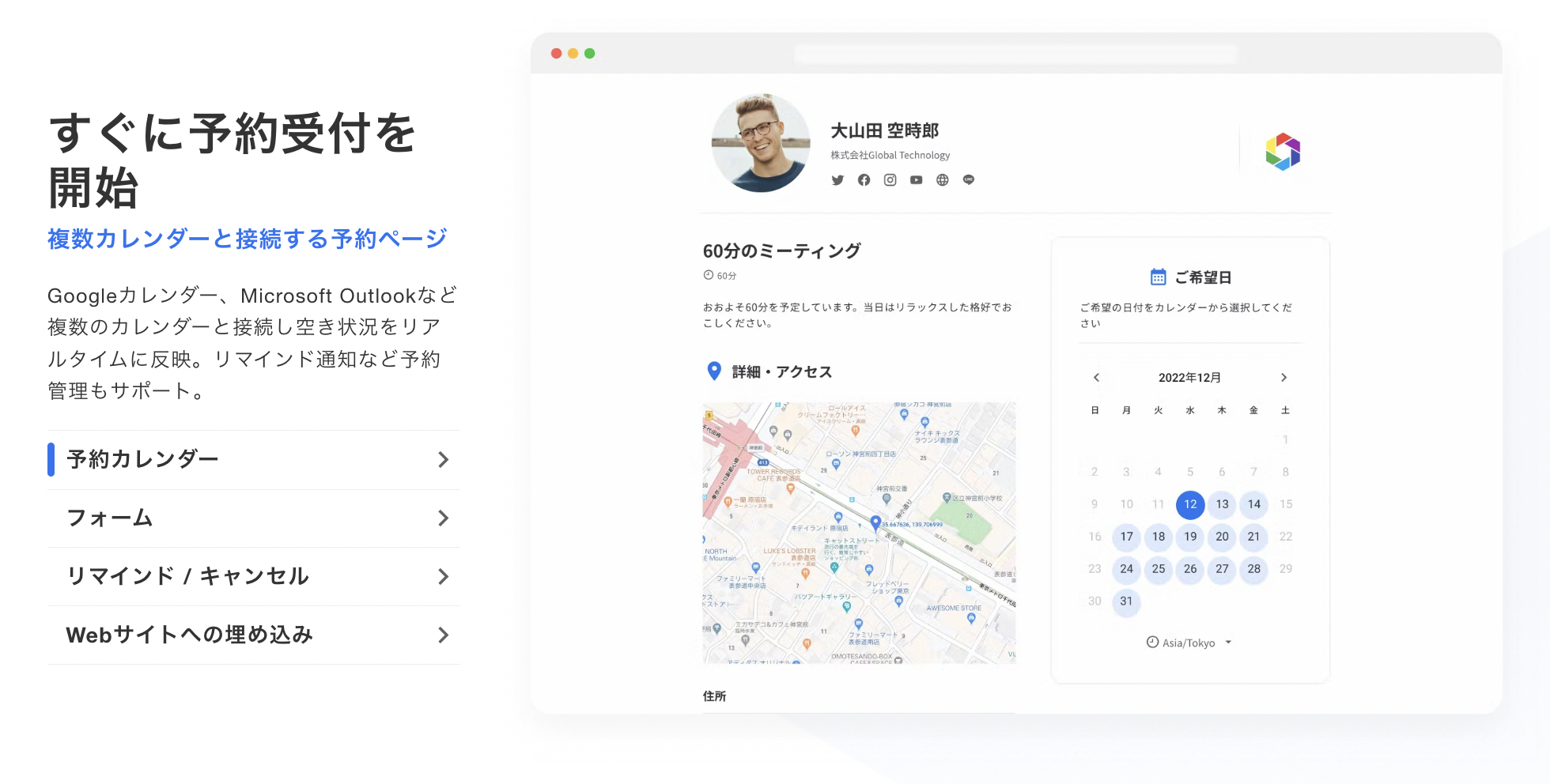1on1〜複数名の日程調整、セミナー型、日程投票など幅広い予約タイプに対応しています。