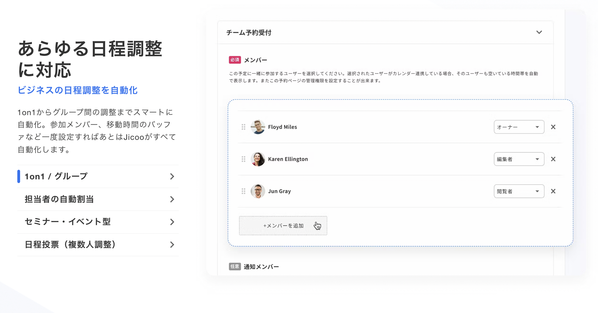 Jicooでは1on1から、複数名出席するミーティングや、自動で担当者をアサインできる機能など多様な日程調整を手軽に設定することができます。
