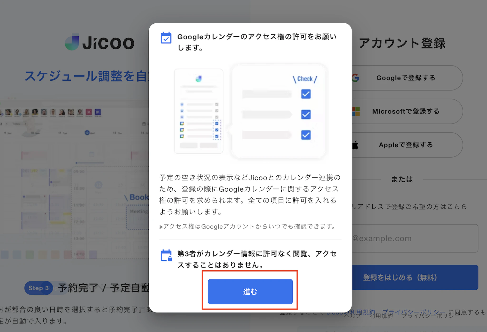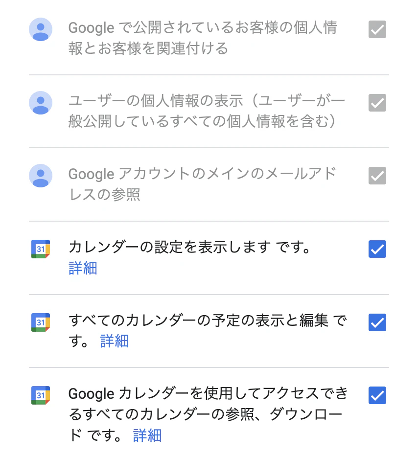 カレンダーのアクセス権許可の注意事項が表示されます。