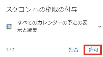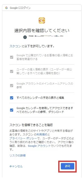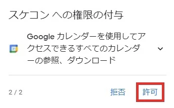選択したアカウントにてカレンダー等への認証を許可すれば、スケコンへのログインは完了します。