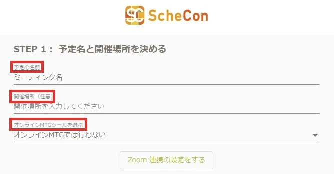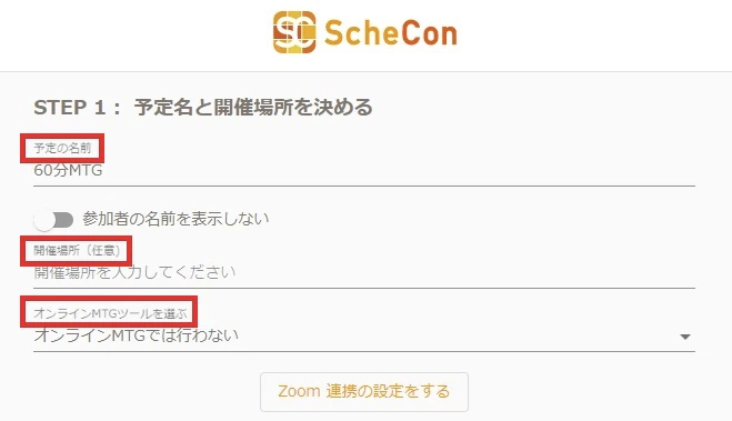 「開催場所」の入力は任意です。「オンラインMTGツールを選ぶ」からは、スケコンとZoomとの連携ができます。