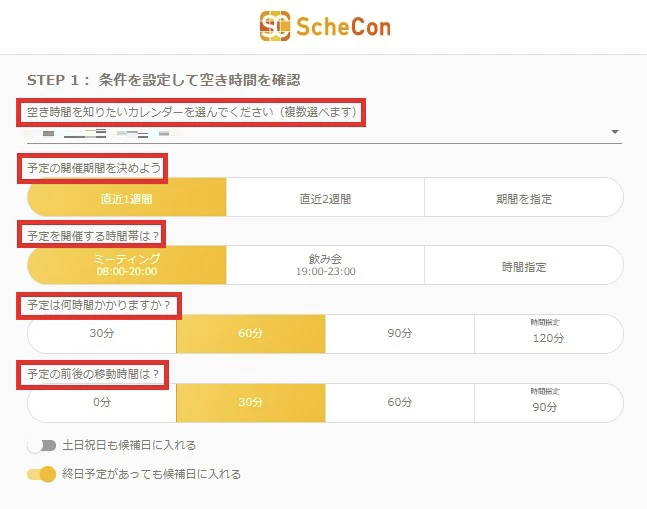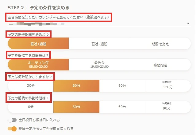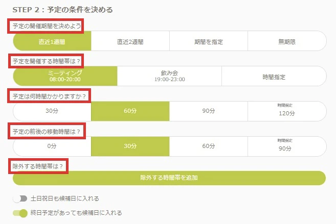 除外する時間帯も任意で設定可能です。例えば、すでに別の予定が入っている場合に除外する時間帯を指定しておくことができます。