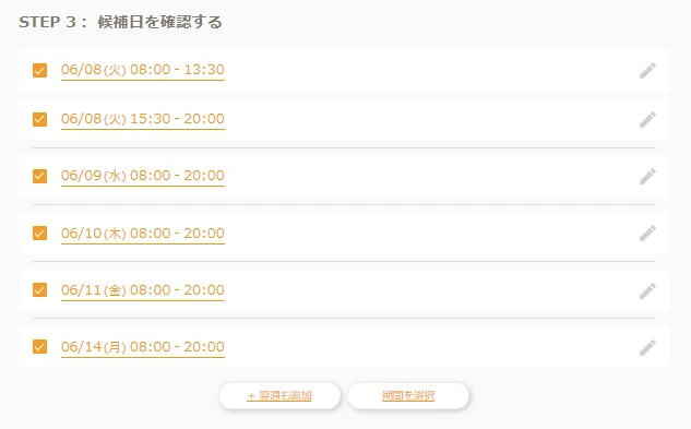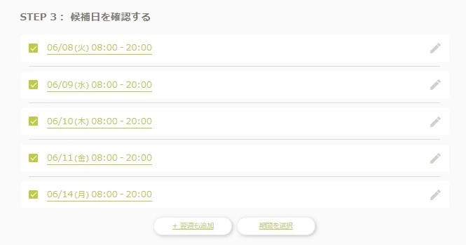 STEP3では、STEP2にて入力した内容をもとに候補日が表示されます。候補日に問題がないかチェックしましょう。