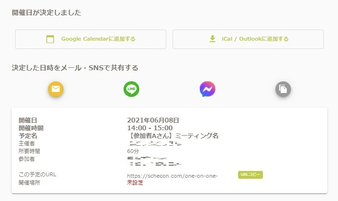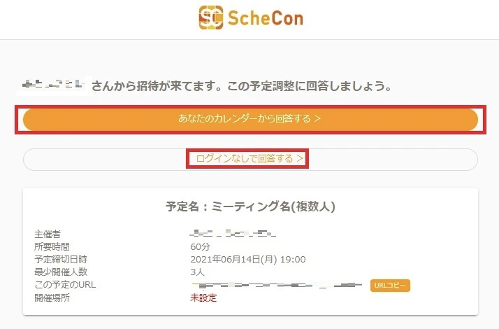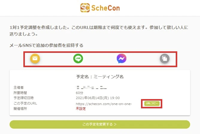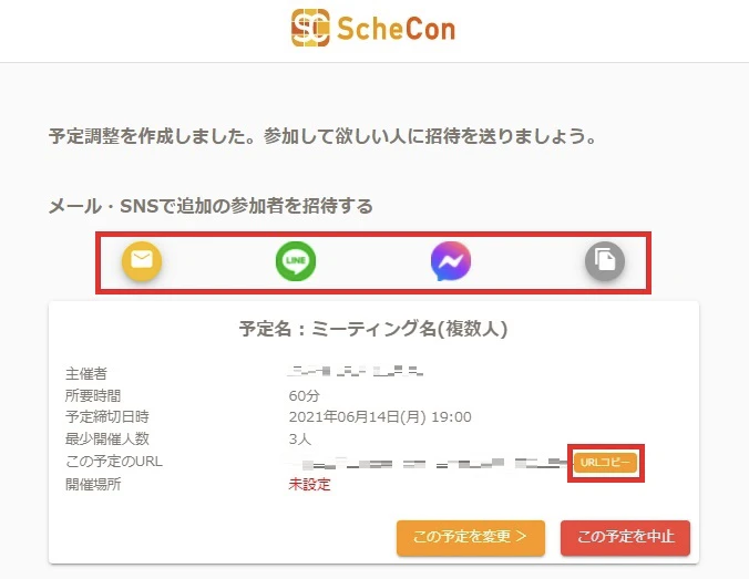 URLコピー」をクリックし、相手にそのリンクを送れば日程調整ができるようになります。また、メールやSNSなどでも参加者の招待は可能です。