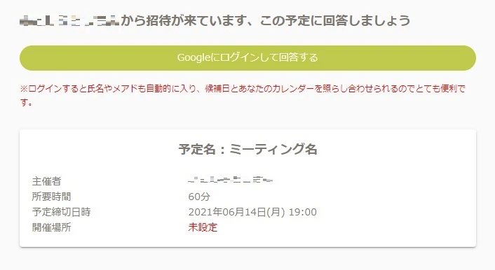 相手側にてリンクを開くと、上記の画面が表示されます。Google/Outlookカレンダーからだけでなくログインなしでも回答可能です。