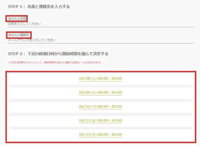 名前」「メールアドレス」を入力し、候補日から選びます。