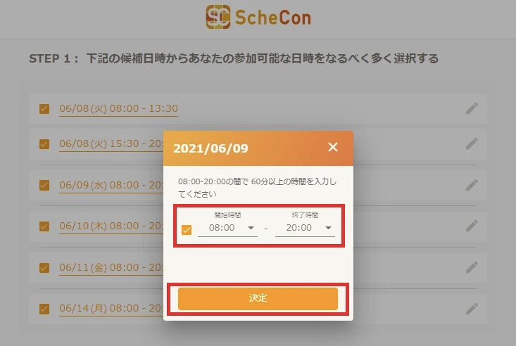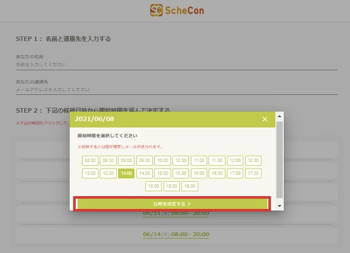 時間を選択のうえ、「日時を決定する」をクリックしましょう。