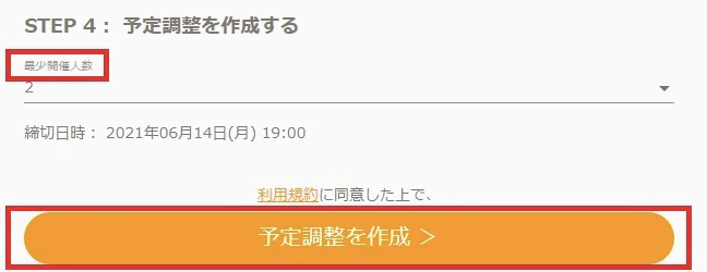 STEP4では、「最小開催人数」にて予定に参加する最小人数を設定し、「予定調整を作成」をクリックします。
