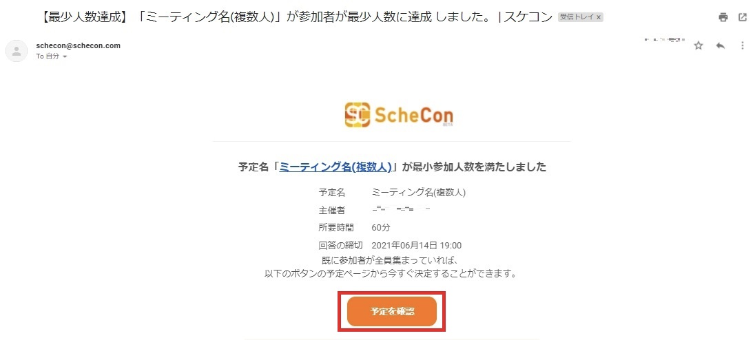 主催者が設定した最小人数以上の参加者が日程調整すると、主催者へ上記のメールが届きます。