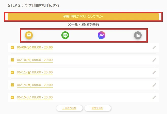 空き時間をテキストでコピーしたり、メール・SNSで共有できたりすることが可能です。
