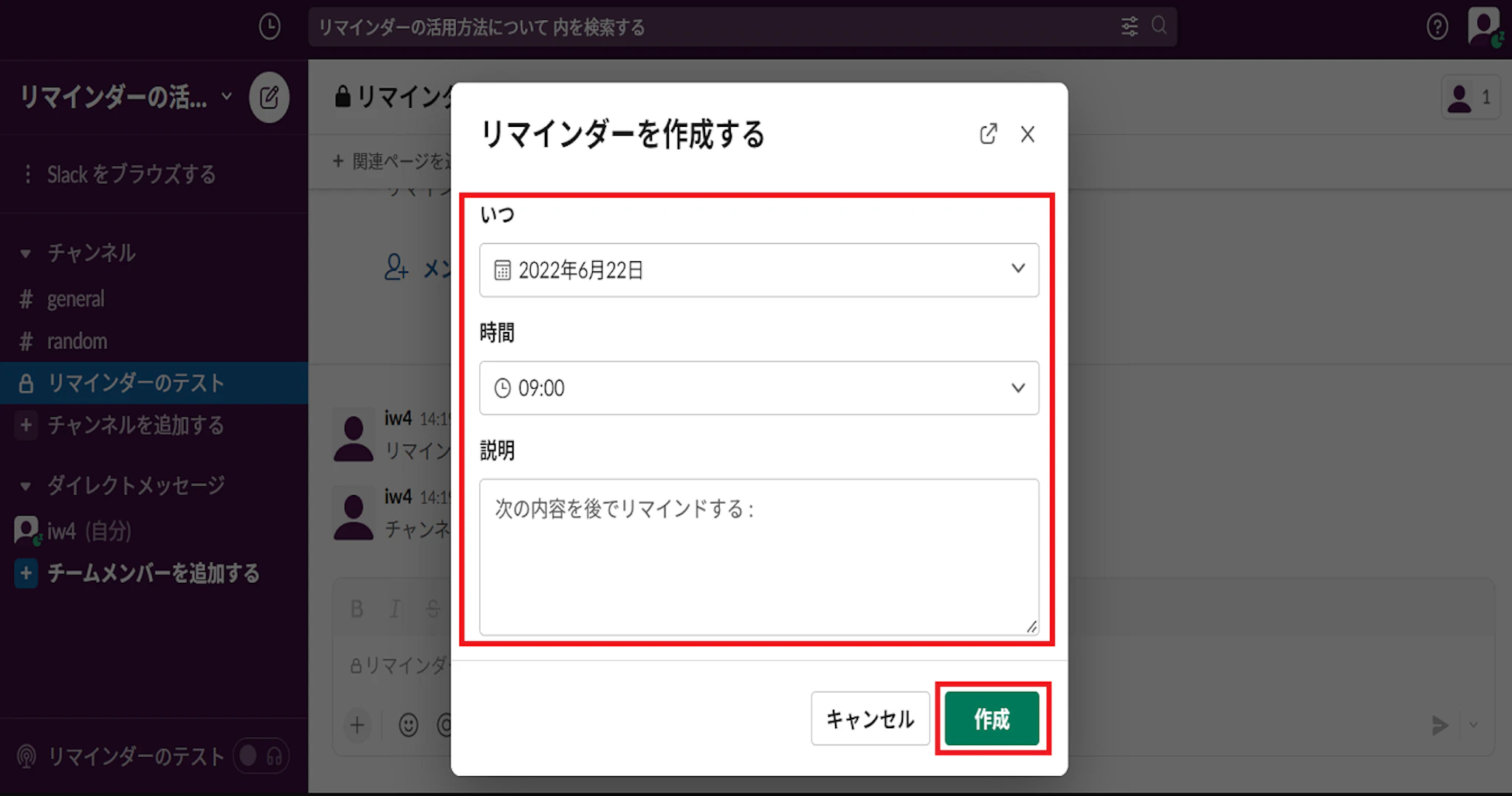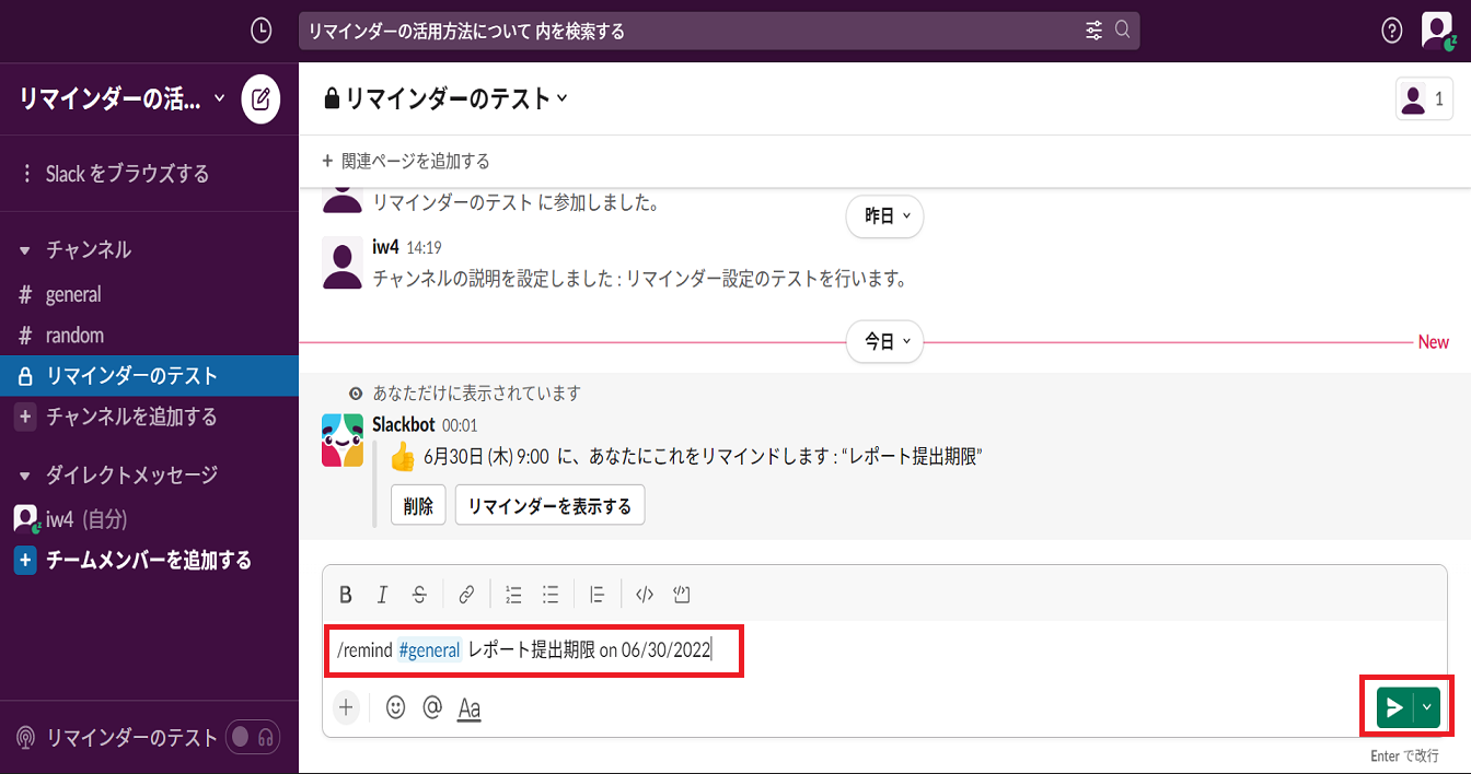 メッセージフィールド内に「/remind」と出てきますので、この後ろに【宛先】、【通知内容】、【いつ】を入力し、メッセージを送信します。