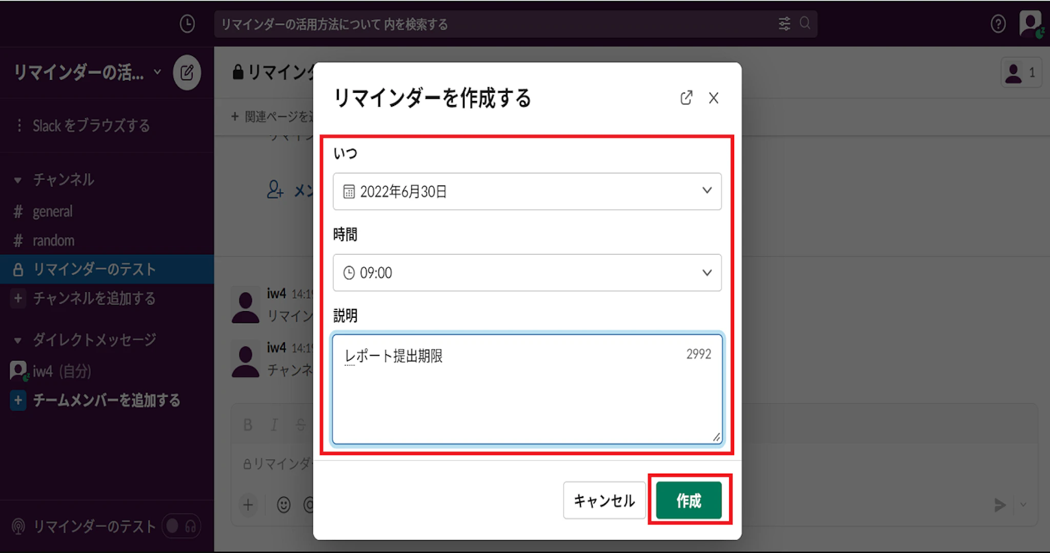 ここでは【ワークスペース全体】に【レポート提出期限】が【6月30日】であることを通知するためのコマンドを入力しています。