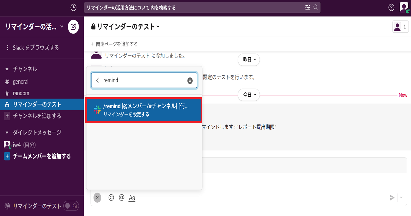 (reと入力した段階で「/remind」と出てきますので、その段階でクリックしても問題ありません。)