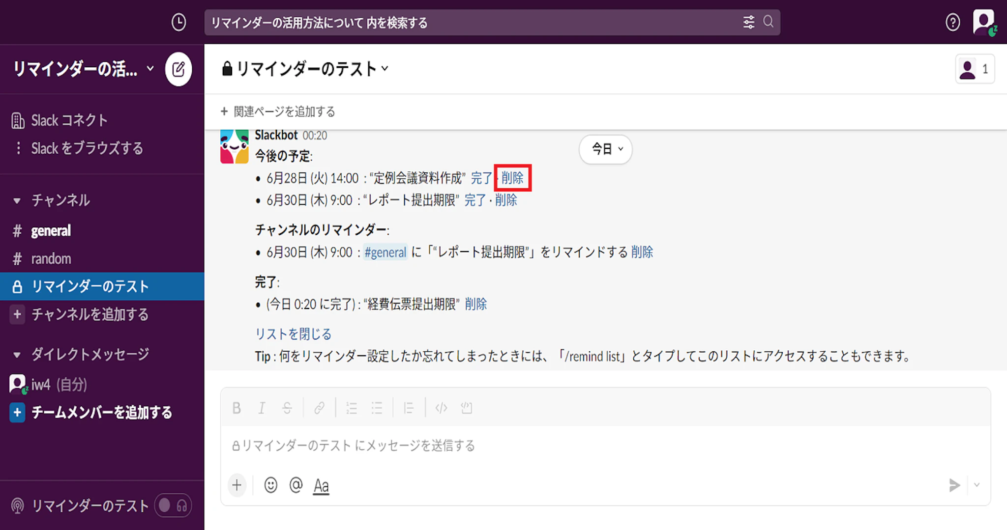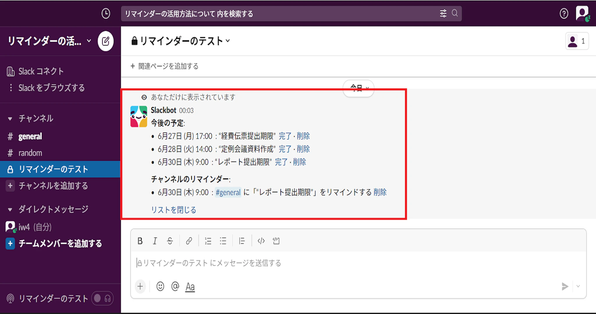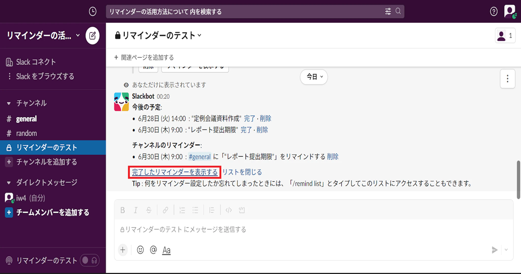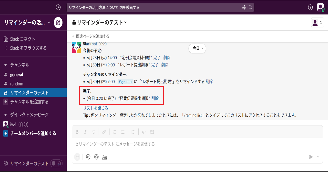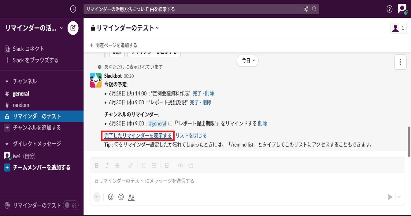 メッセージフィールドに /remind list と入力して、メッセージを送信すると、設定したリマインダーのリストが表示されます。