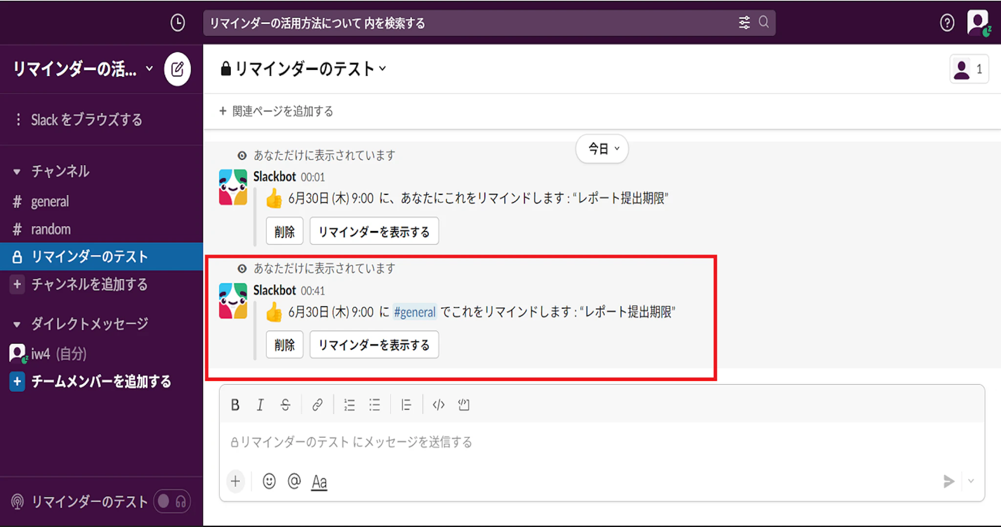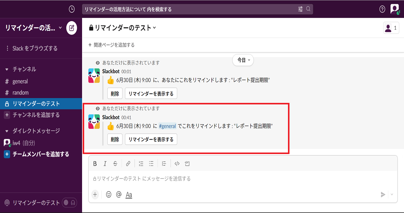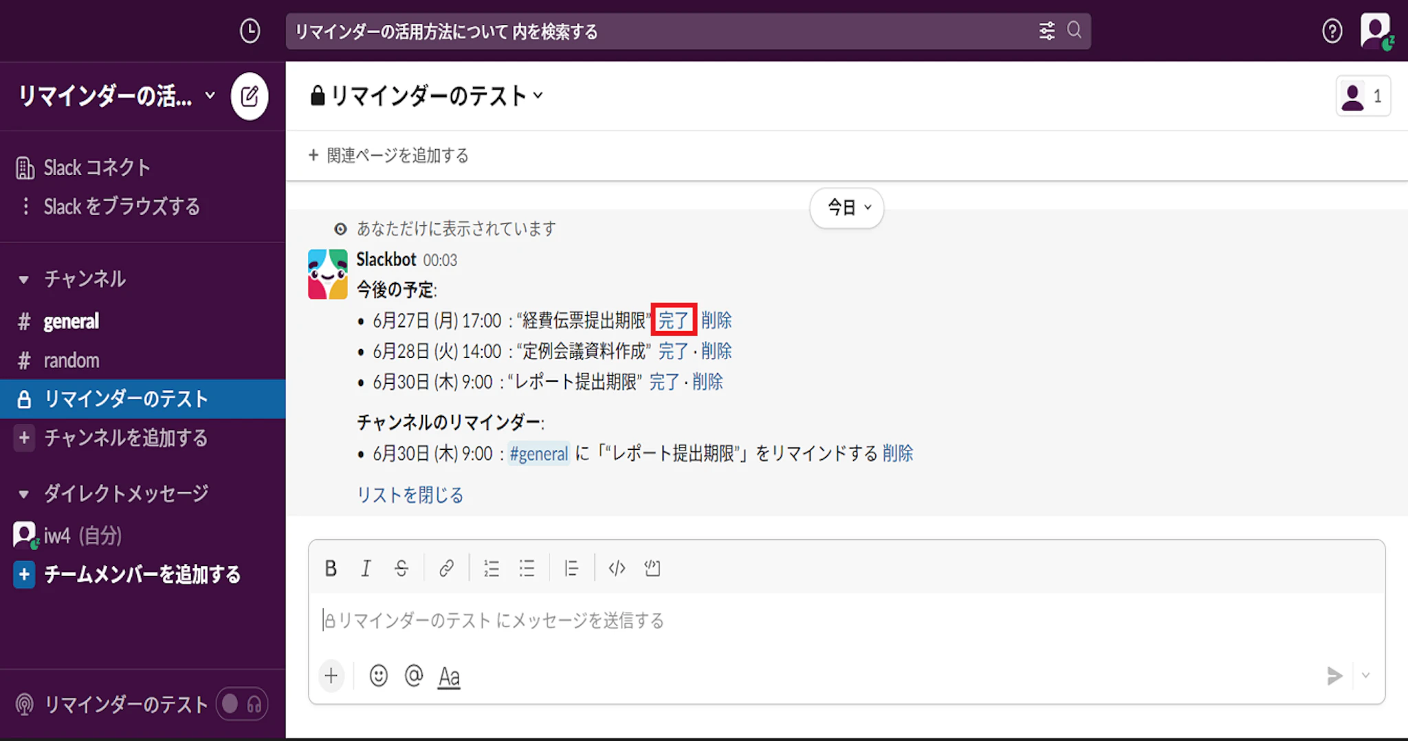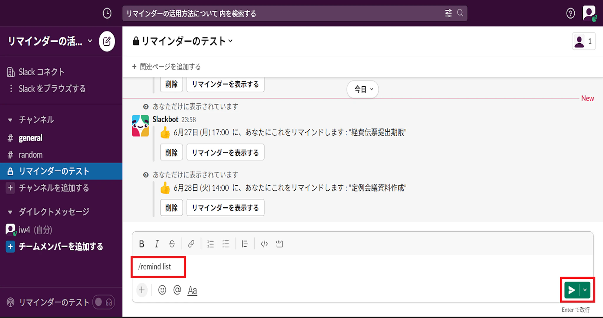 メッセージフィールドに /remind list と入力して、メッセージを送信すると、設定したリマインダーのリストが表示されます。