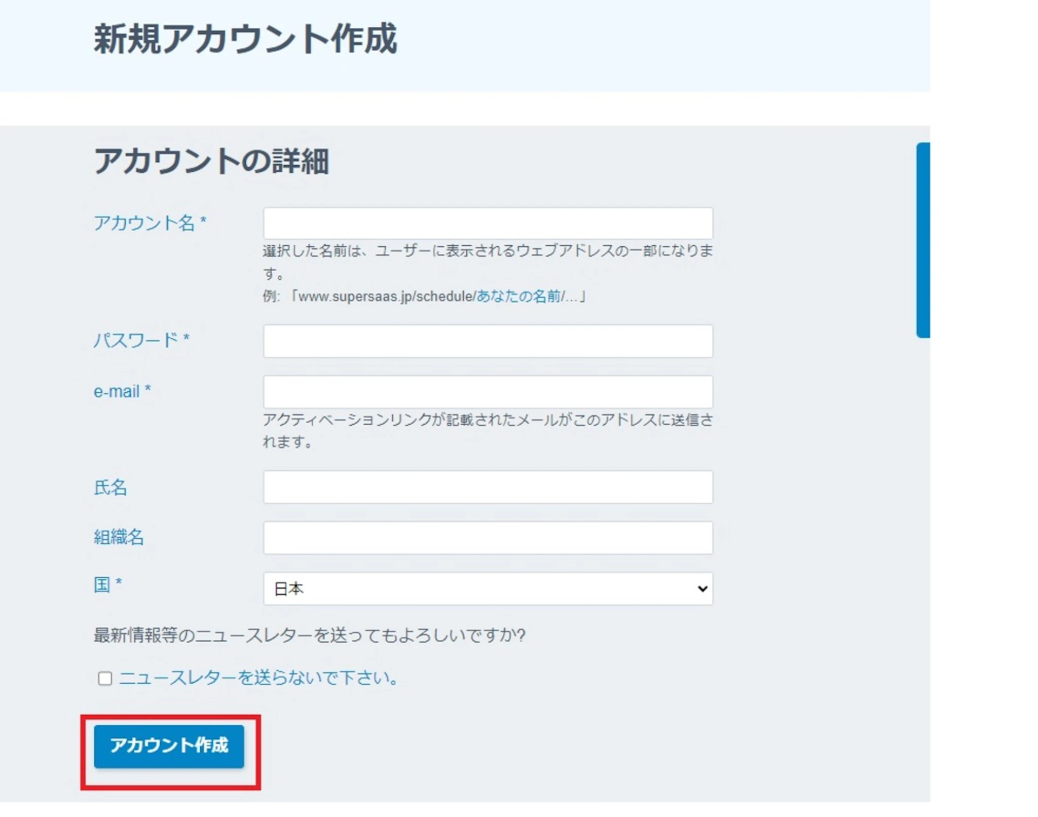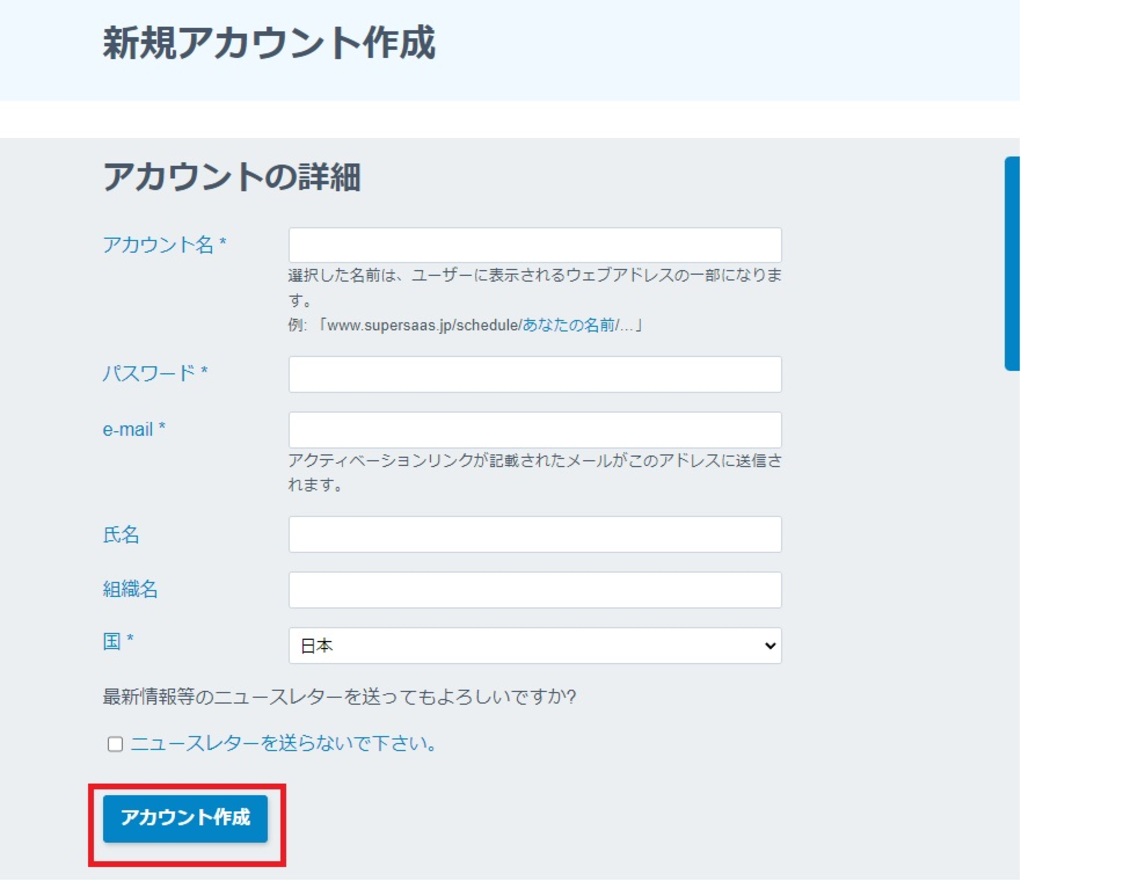 必須事項となっている箇所に記載し、アカウント作成をクリックすると、自分のアカウントが作成できます。