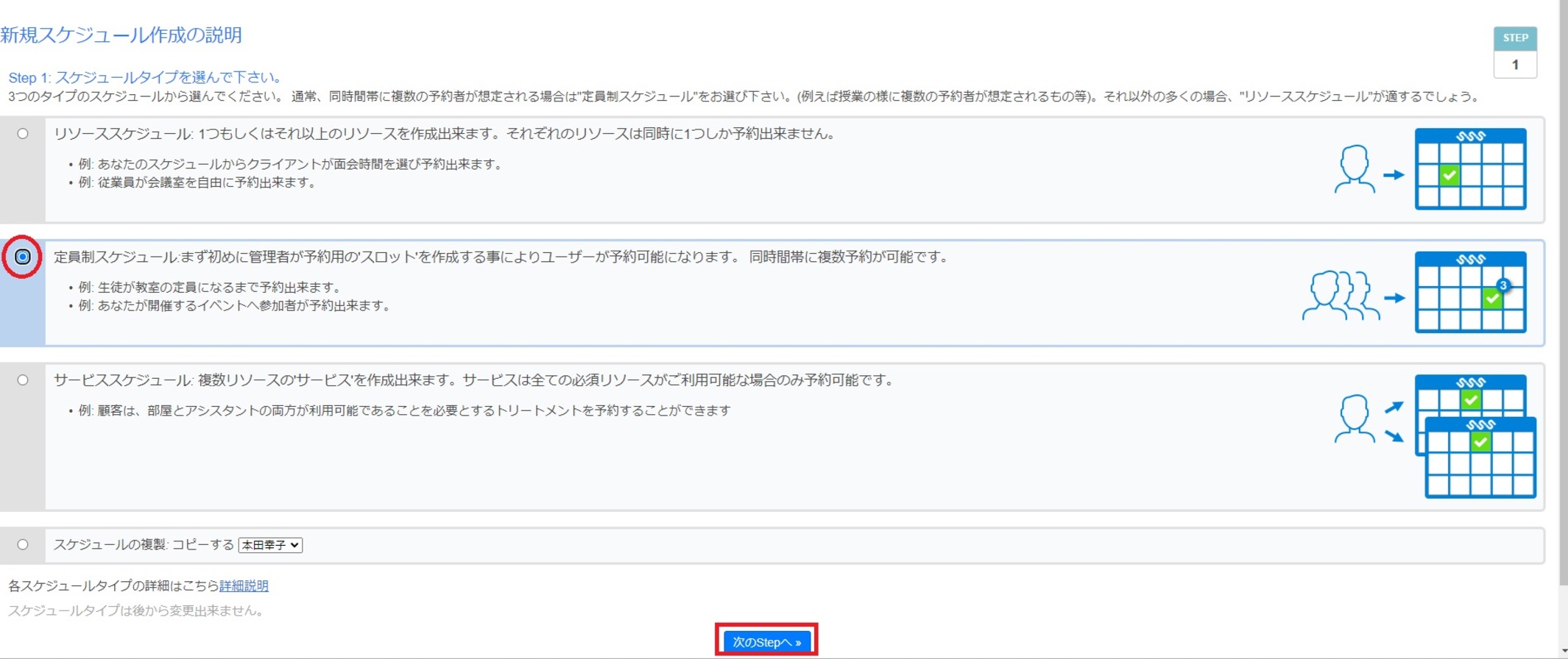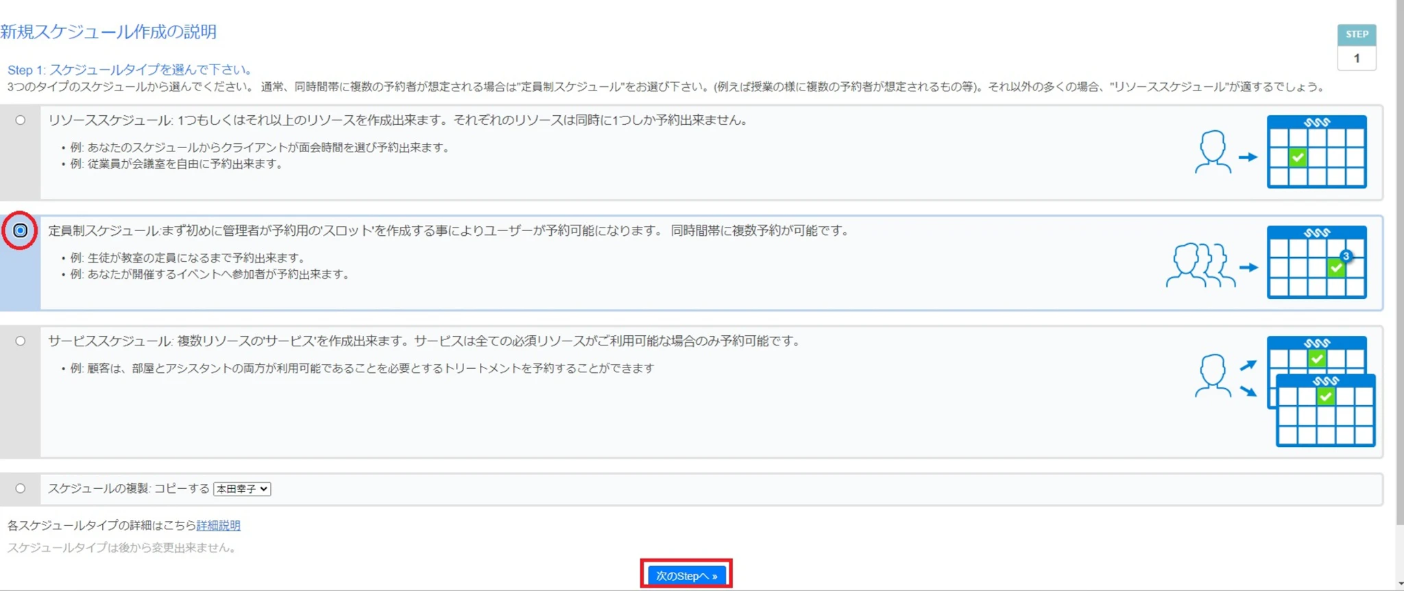 スケジュールタイプには3つのパターンがあり、今回は2つ目の定員制スケジュール(生徒が定員に達するまで予約可能)に設定します。