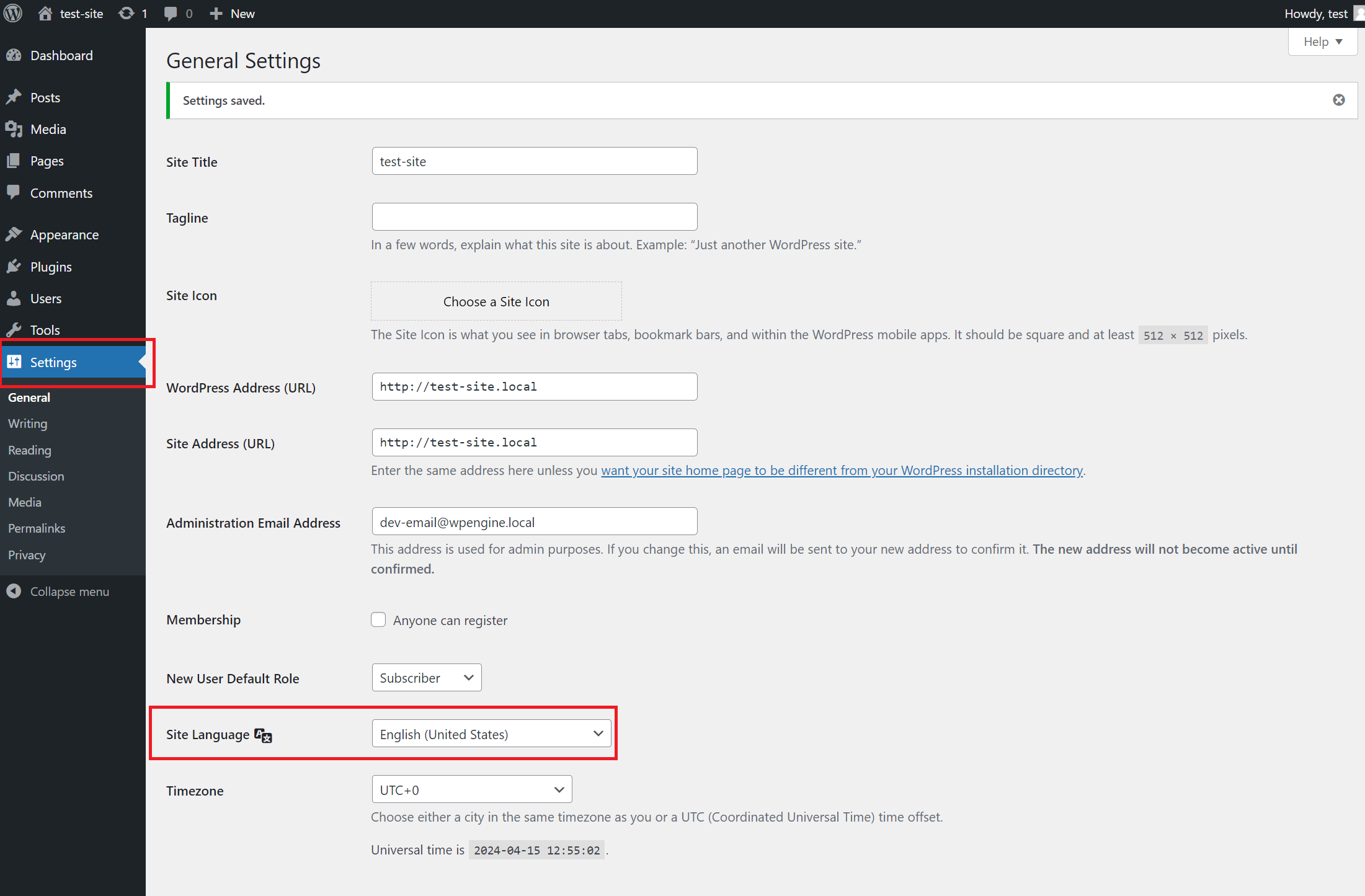 なお、初回は言語設定が英語のままになっています。左メニューから「Settings」をクリックして、 Site Languageを日本語に変更しておきましょう。