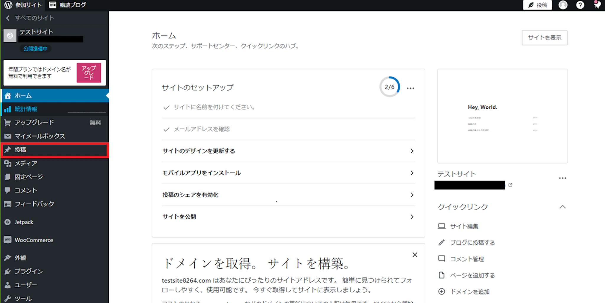 まずは、トップページの左メニューから「投稿」を選びます。四つのサブメニューがありますが、初期設定時に自動で作成された記事を確認するために「投稿一覧」から見るといいでしょう。
