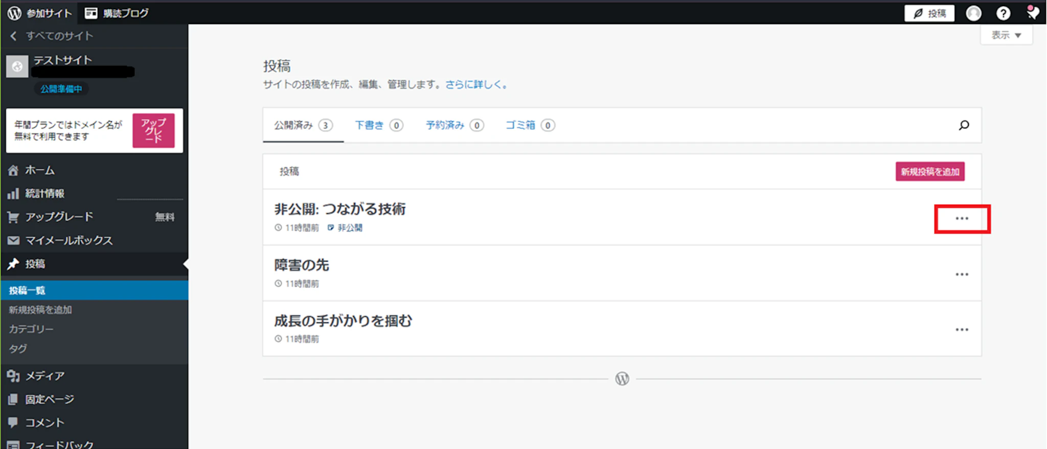 投稿一覧画面では、作成済みの投稿・下書き・予約済みの投稿などを確認できます。デフォルトで作成された投稿は不要になるので、内容を確認したら右端の三点リーダーから削除しておくといいでしょう。