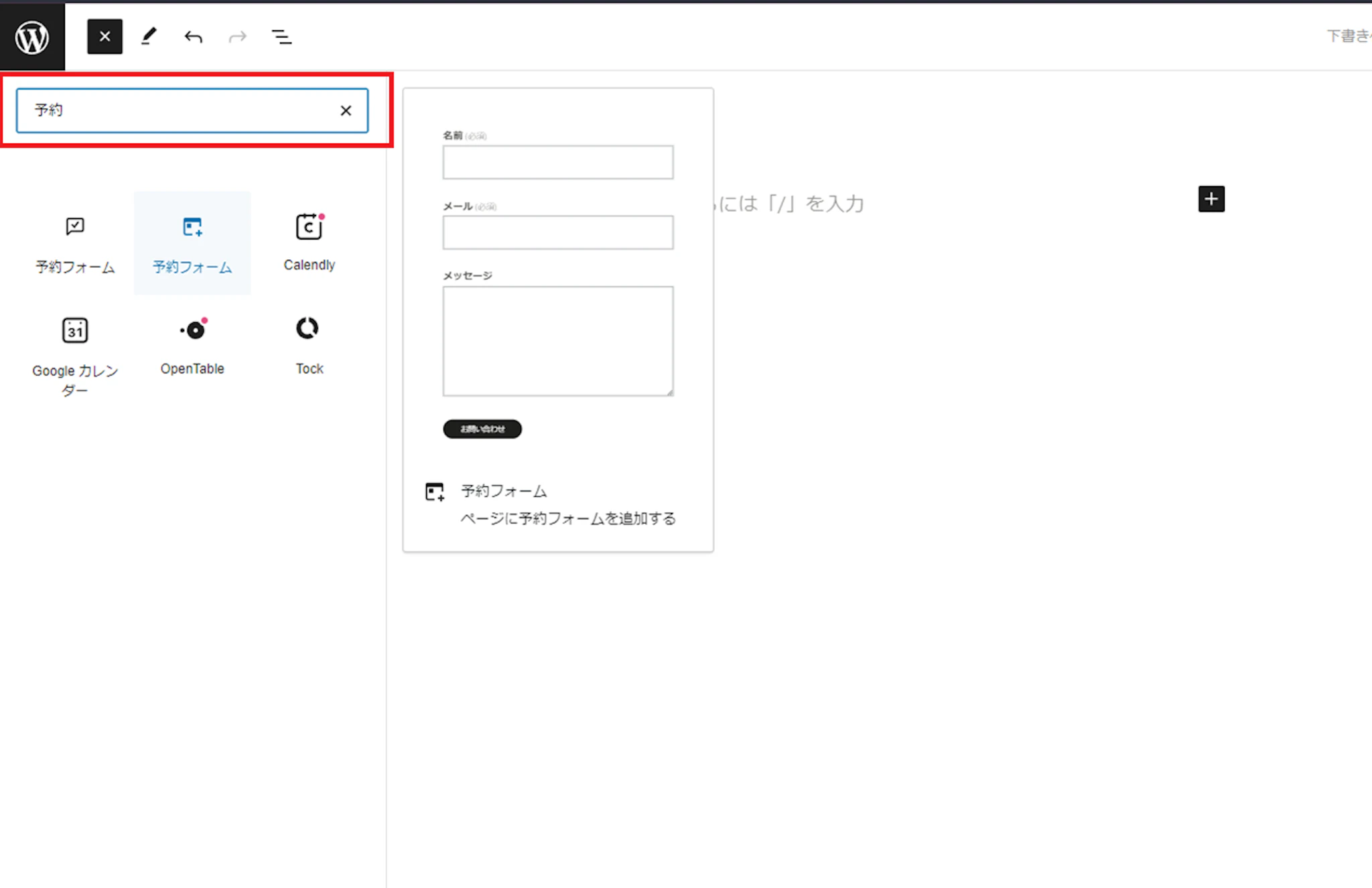 ブロック挿入ツールボタンをクリックして検索窓を表示したら、予約フォームを探します。