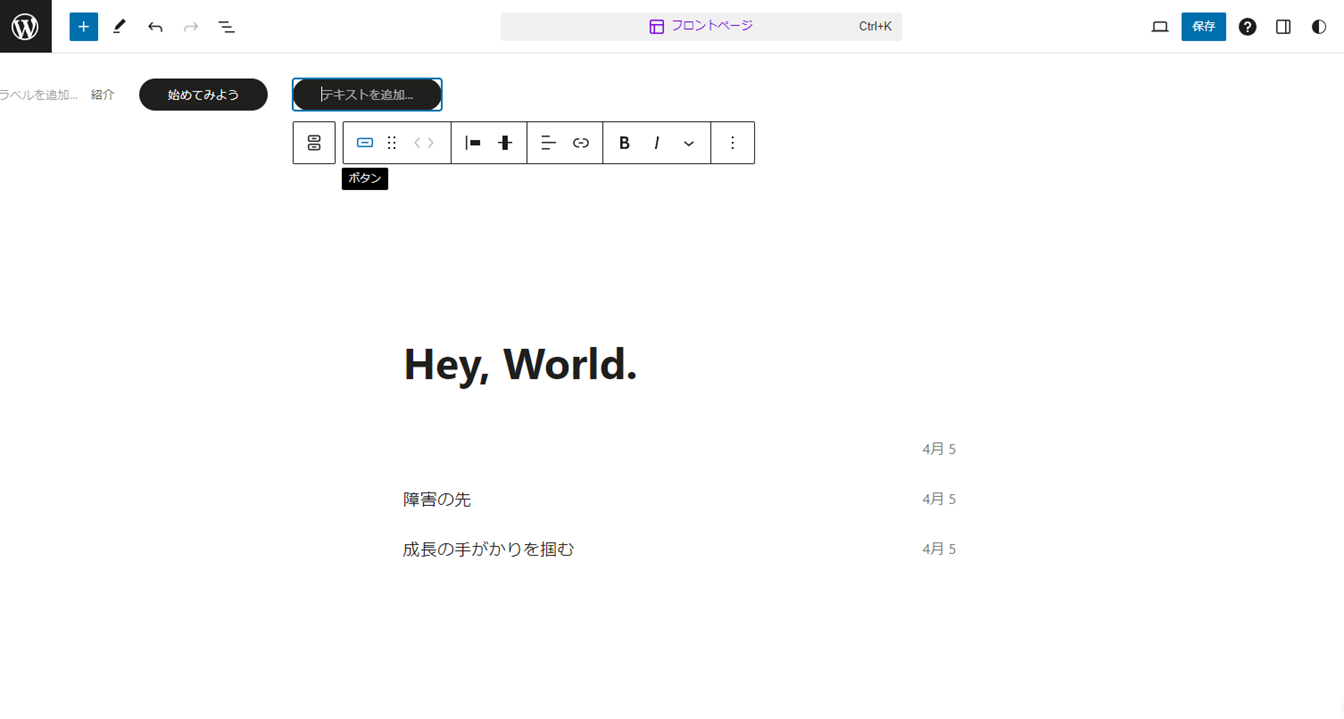 ブロックの検索窓が表示されるので、ボタンを検索してヘッダーにボタンを追加します。ボタンに表示するテキストとリンク先(先程つくっておいた固定ページ)を設定し、編集内容を保存します。