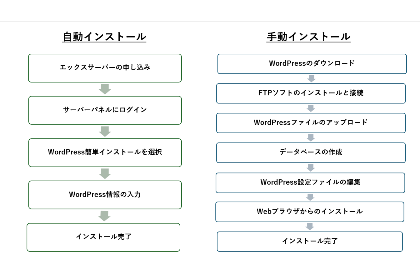 WordPressのインストール方法には、自動インストールと手動インストールの2種類があります。