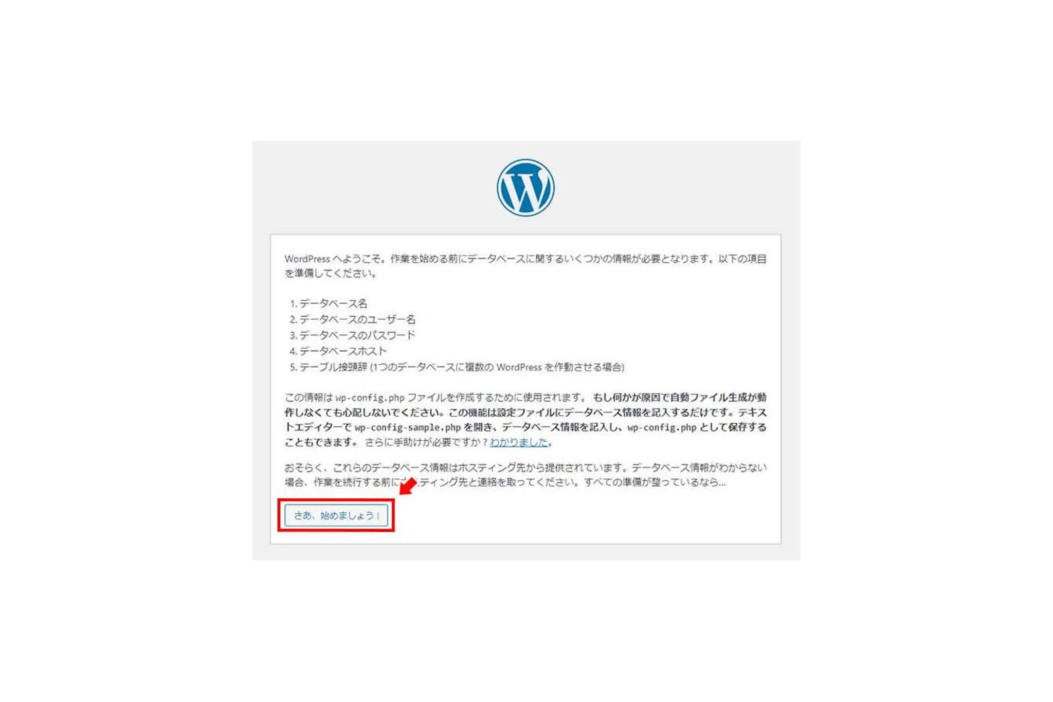wp-config.phpに記述したデータベース名、ユーザー名、パスワードに誤りがないか確認しましょう。